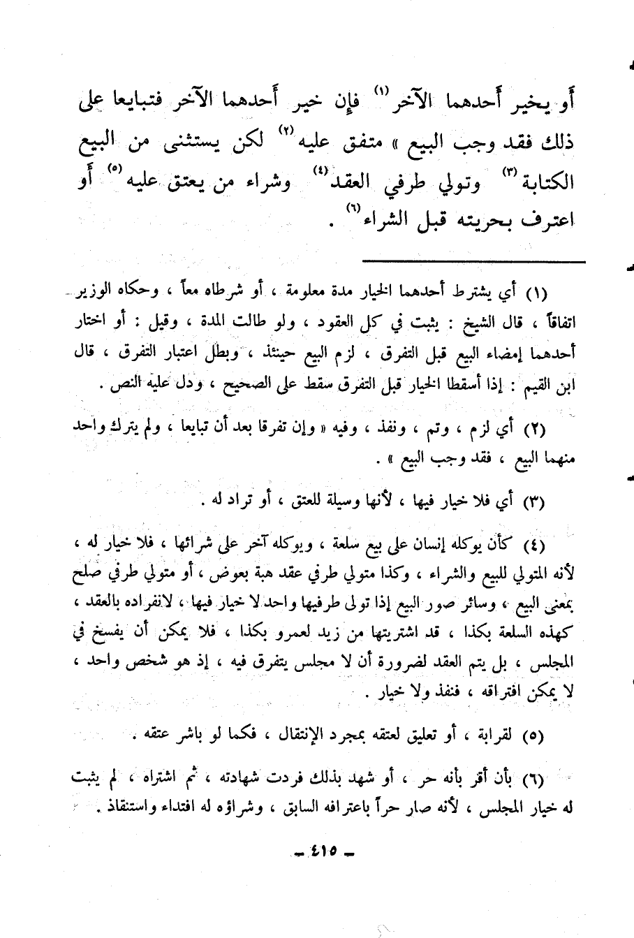 أو يخير أحدهما الآخر (¬1) فإن خير أحدهما الآخر فتبايعا على ذلك فقد وجب البيع» متفق عليه (¬2) لكن يستثنى من البيع الكتابة (¬3) وتولي طرفي العقد (¬4) وشراء من يعتق عليه (¬5) أو اعترف بحريته قبل الشراء (¬6) .