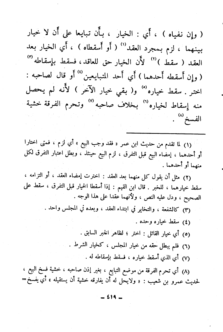 (¬8) أي تحرم الفرقة من موضع التبايع، بغير إذن صاحبه، خشية فسخ البيع، لحديث عمرو بن شعيب: «ولا يحل له أن يفارقه خشية أن يستقيله» أي يفسخ