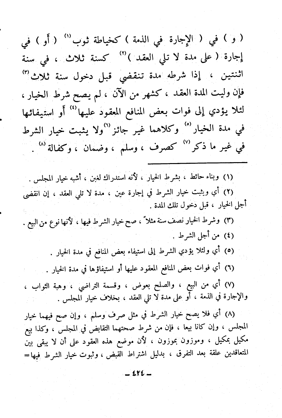 (¬8) أي فلا يصح خيار الشرط في مثل صرف وسلم، وإن صح فيهما خيار المجلس، وإن كانا بيعا فإن من شرط صحتهما التقابض في المجلس، وكذا بيع مكيل بمكيل، وموزون بموزون، لأن موضع هذه العقود على أن لا يبقى بين المتعاقدين علقة بعد التفرق، بدليل اشتراط القبض، وثبوت خيار الشرط فيها