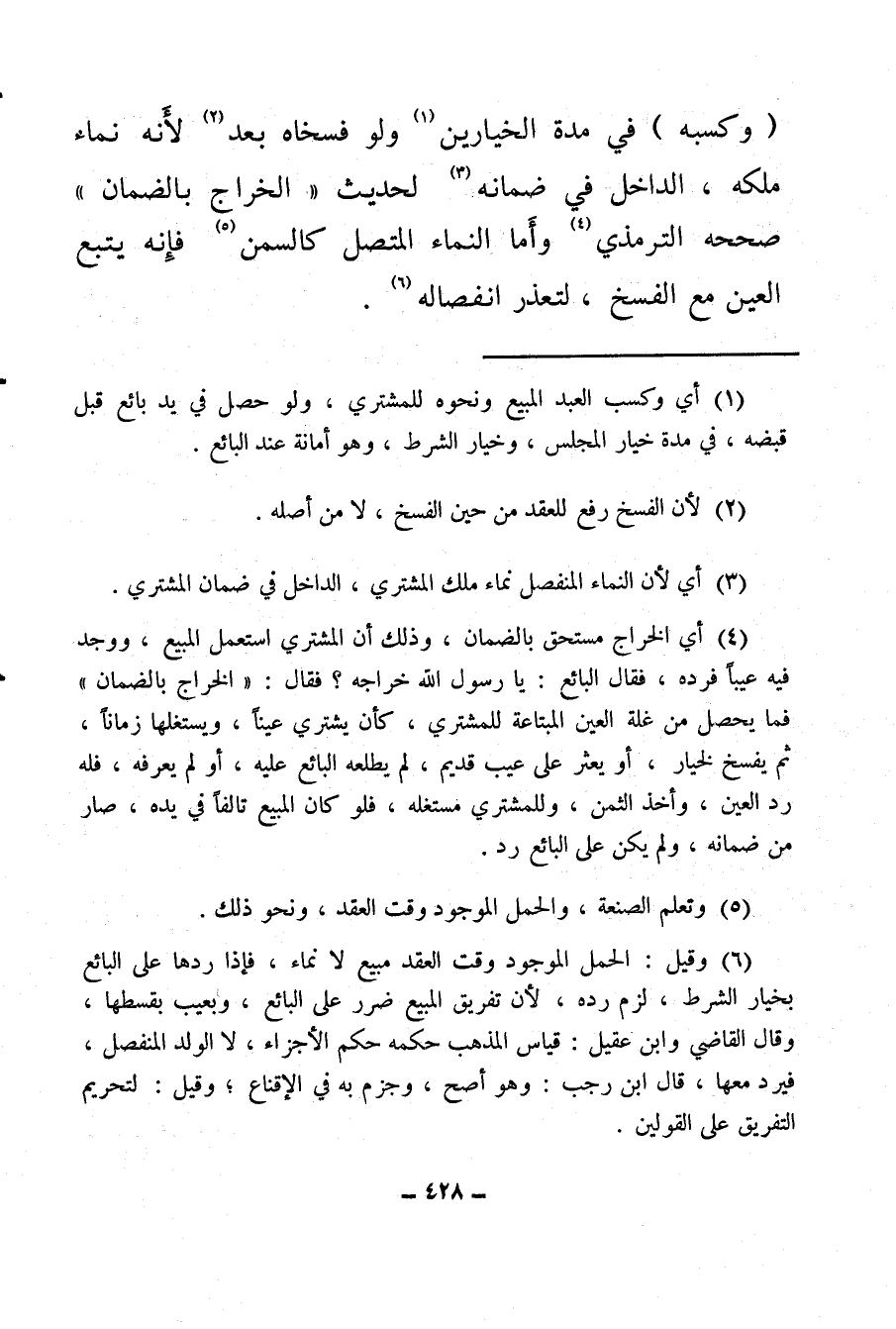 (¬4) أي الخراج مستحق بالضمان وذلك أن المشتري استعمل المبيع، ووجد فيه عيبا فرده، فقال البائع: يا رسول الله خراجه؟ فقال: «الخراج بالضمان» فما يحصل من غلة العين المبتاعة للمشتري، كأن يشتري عينا، ويستغلها زمانا، ثم يفسخ لخيار، أو يعثر على عيب قديم، لم يطلعه البائع عليه، أو لم يعرفه، فله رد العين، وأخذ الثمن، وللمشتري مستغله، فلو كان المبيع تالفا في يده صار من ضمانه ولم يكن على البائع رد.