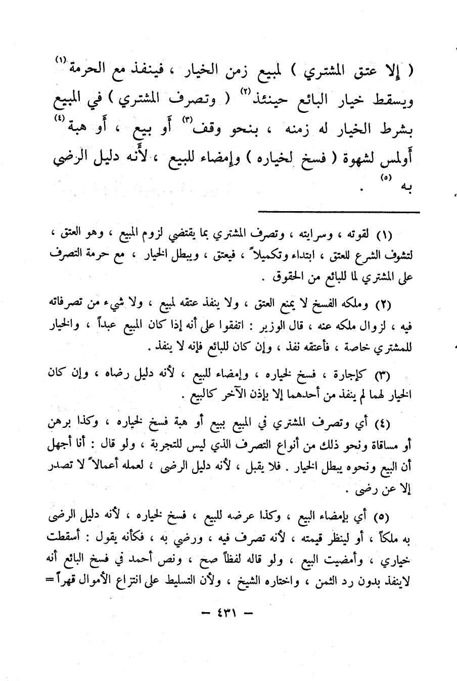 (¬5) أي بإمضاء البيع، وكذا عرضه للبيع، فسخ لخياره، لأنه دليل الرضى به ملكا، أو لينظر قيمته، لأنه تصرف فيه، ورضي به، فكأنه يقول: أسقطت خياري: وأمضيت البيع، ولو قاله لفظا صح، ونص أحمد في فسخ البائع أنه لا ينفذ بدون رد الثمن، واختاره الشيخ، ولأن التسليط على انتزاع الأموال قهرا.