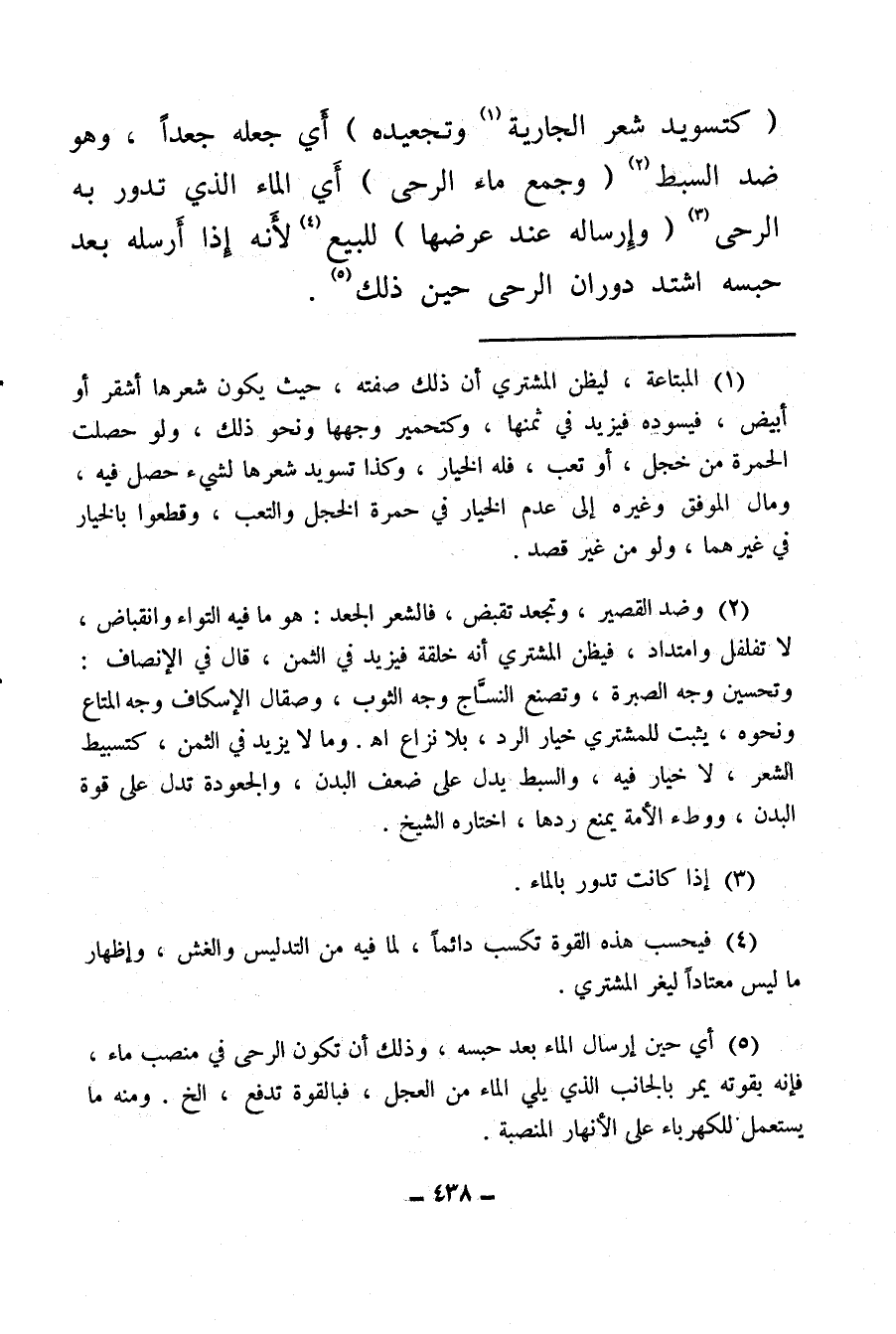 (كتسويد شعر الجارية (¬1) وتجعيده) أي جعله جعدا، وهو ضد السبط (¬2) (وجمع ماء الرحى) أي الماء الذي تدور به الرحى (¬3) (وإرساله عند عرضها) للبيع (¬4) لأنه إذا أرسله بعد حبسه اشتد دوران الرحى حين ذلك (¬5) .