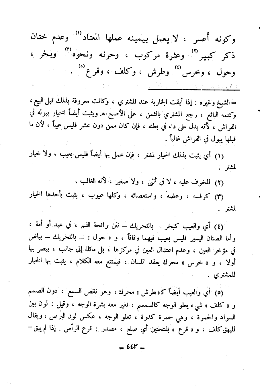 وكونه أعسر، لا يعمل بيمينه عملها المعتاد (¬1) وعدم ختان ذكر كبير (¬2) وعثرة مركوب، وحرنة ونحوه (¬3) وبخر، وحول، وخرس (¬4) وطرش، وكلف وقرع (¬5) .
