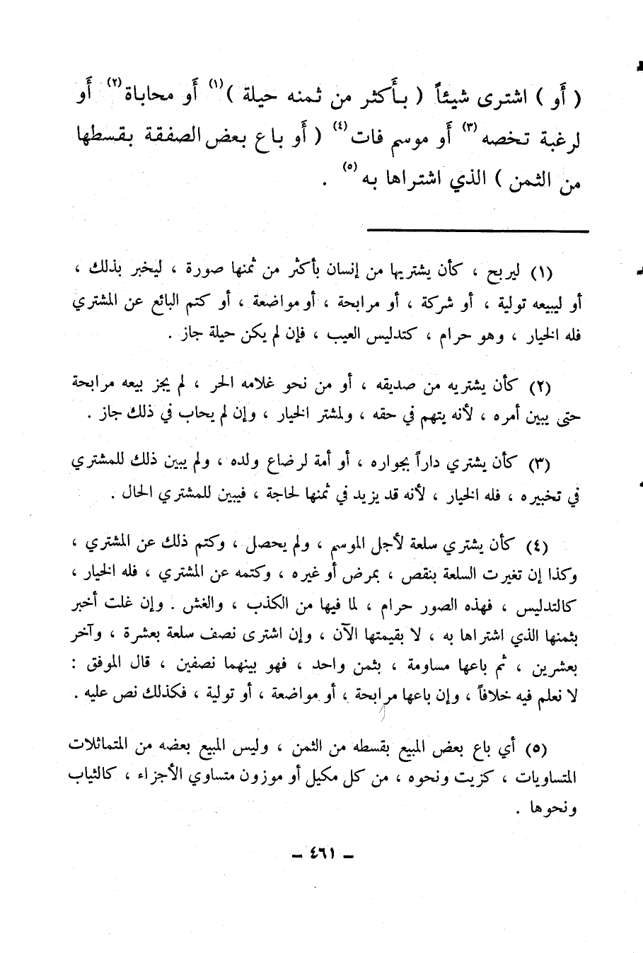 (¬1) ليربح، كأن يشتريها من إنسان بأكثر من ثمنها صورة، ليخبر بذلك، أو ليبيعه تولية، أو شركة، أو مرابحة، أو موضعة، أو كتم البائع عن المشتري فله الخيار، وهو حرام، كتدليس العيب، فإن لم يكن حيلة جاز.