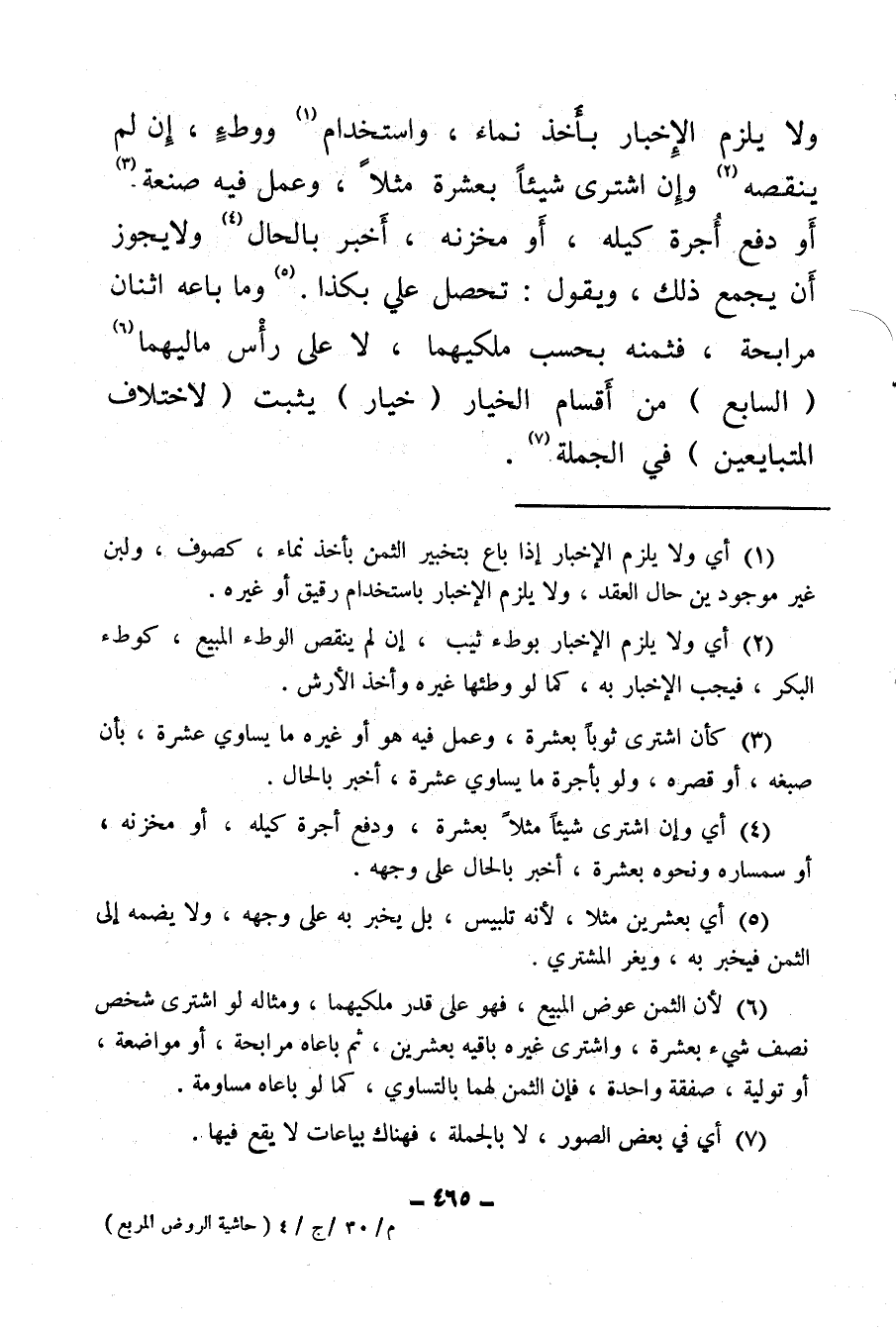 ولا يلزم الإخبار بأخذ نماء، واستخدام (¬1) ووطء، إن لم ينقصه (¬2) وإن اشترى شيئا بعشرة مثلا، وعمل فيه صنعة (¬3) أو دفع أجرة كيله، أو مخزنه، أخبر بالحال (¬4) ولا يجوز أن يجمع ذلك، ويقول: تحصل علي بكذا (¬5) وما باعه اثنان مرابحة، فثمنه بحسب ملكيهما، لا على رأس ماليهما (¬6) (السابع) من أقسام الخيار (خيار) يثبت (لاختلاف المتبايعين) في الجملة (¬7) .