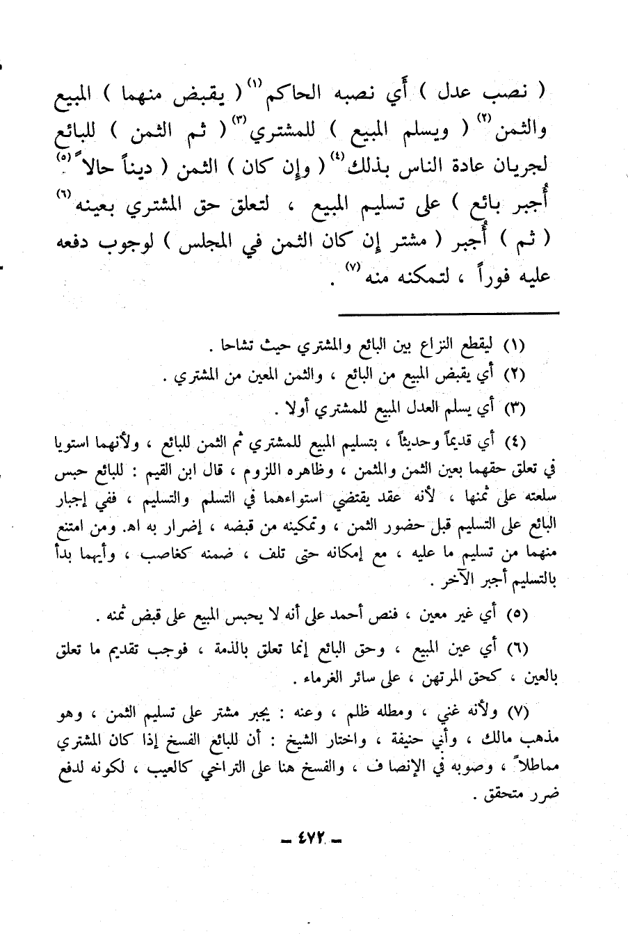 (نصب عدل) أي نصبه الحاكم (¬1) (يقبض منهما) المبيع والثمن (¬2) (ويسلم المبيع) للمشتري (¬3) (ثم الثمن) للبائع لجريان عادة الناس بذلك (¬4) (وإن كان) الثمن (دينا حالا (¬5) أجبر بائع) على تسليم المبيع، لتعلق حق المشتري بعينه (¬6) (ثم) أجبر (مشتر إن كان الثمن في المجلس) لوجوب دفعه عليه فورا، لتمكنه منه (¬7) .
