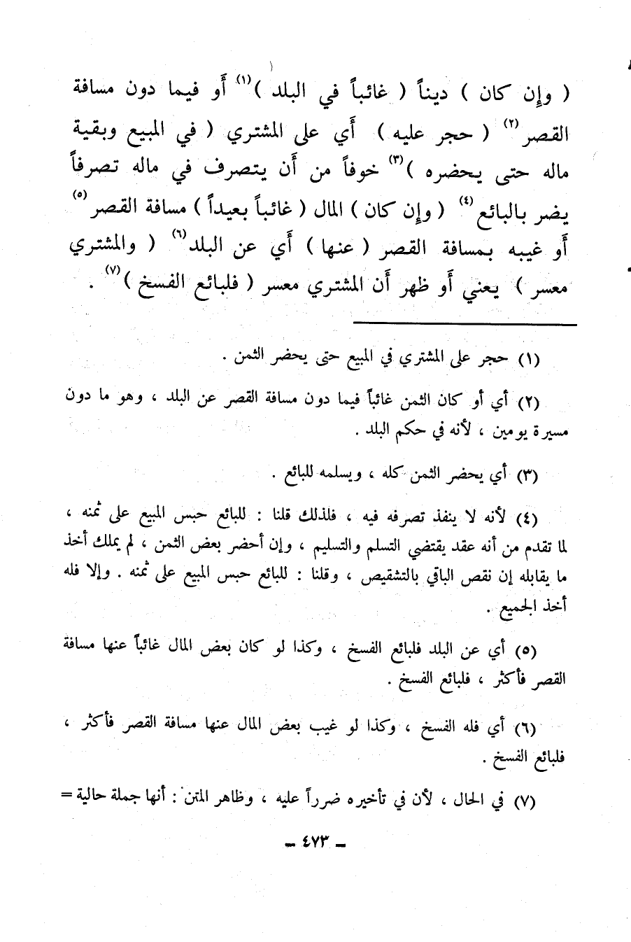 (¬5) أي عن البلد فلبائع الفسخ، وكذا لو كان بعض المال غائبا عنها مسافة القصر فأكثر، فلبائع الفسخ.