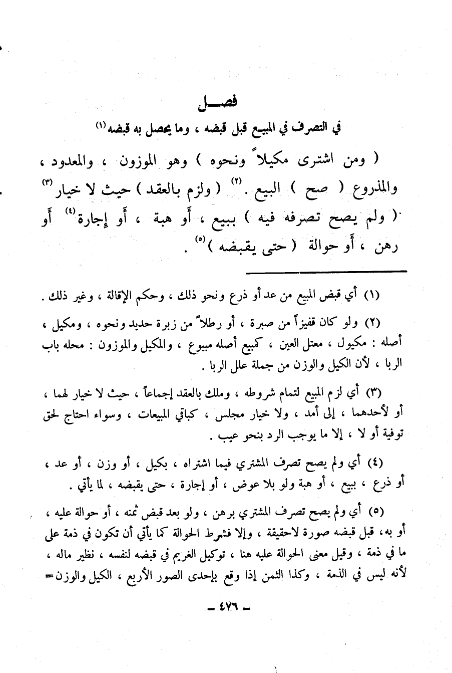 (¬4) أي ولم يصح تصرف المشتري فيما اشتراه بكيل، أو وزن، أو عد، أو ذرع، ببيع، أو هبة ولو بلا عوض، أو إجارة حتى يقبضه لما يأتي.