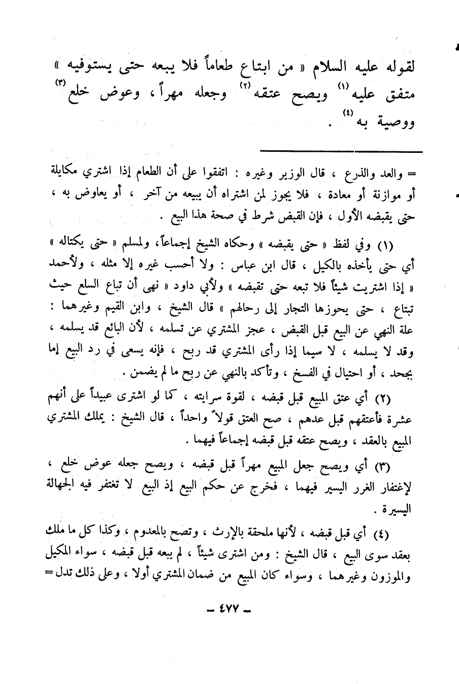 (¬1) وفي لفظ «حتى يقبضه» وحكاه الشيخ إجماعا، ولمسلم «حتى يكتاله» أي حتى يأخذه بالكيل، قال ابن عباس: ولا أحسب غيره إلا مثله، ولأحمد «إذا اشتريت شيئا فلا تبعه حتى تقبضه» ولأبي داود «نهى أن تباع السلع حيث تبتاع حتى يحوزها التجار إلى رحالهم» قال الشيخ: وابن القيم وغيرهما: علة النهي عن البيع قبل القبض، عجز المشتري عن تسلمه، لأن البائع قد يسلمه، وقد لا يسلمه، لا سيما إذا رأى المشتري قد ربح، فإنه يسعى في رد البيع إما بجحد أو احتيال في الفسخ، وتأكد بالنهي عن ربح ما لم يضمن.