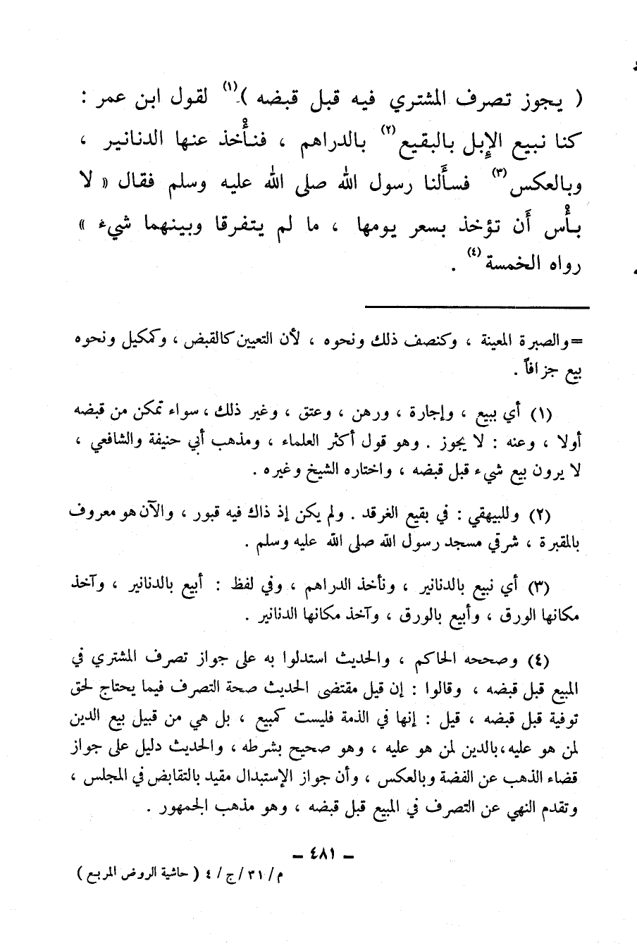 (¬4) وصححه الحاكم، والحديث استدلوا به على جواز تصرف المشتري في المبيع قبل قبضه، وقالوا: إن قيل مقتضى الحديث صحة التصرف فيما يحتاج لحق توفية قبل قبضه، قيل: إنها في الذمة فليست كمبيع، بل هي من قبيل بيع الدين لمن هو عليه، بالدين لمن هو عليه، وهو صحيح بشرطه، والحديث دليل على جواز قضاء الذهب عن الفضة وبالعكس، وأن جواز الاستبدال مقيد بالتقابض في المجلس، وتقدم النهي عن التصرف في المبيع قبل قبضه، وهو مذهب الجمهور.