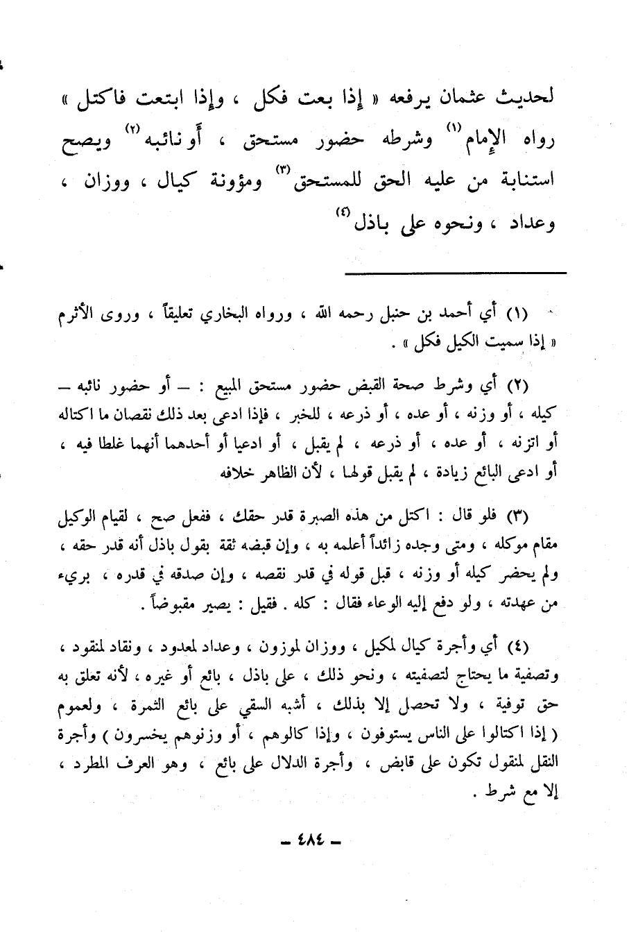 (¬4) أي وأجرة كيال لمكيل، ووزان لموزون، وعداد لمعدود، ونقاد لمنقود، وتصفية ما يحتاج لتصفيته، ونحو ذلك، على باذل، بائع أو غيره، لأنه تعلق به حتى توفية، ولا تحصل إلا بذلك، أشبه السقي على بائع الثمرة، ولعموم (إذا اكتالوا على الناس يستوفون، وإذا كالوهم أووزنوهم يخسرون) وأجرة النقل لمنقول تكون على قابض، وأجرة الدلال على بائع، وهو العرف المطرد، إلا مع شرط.