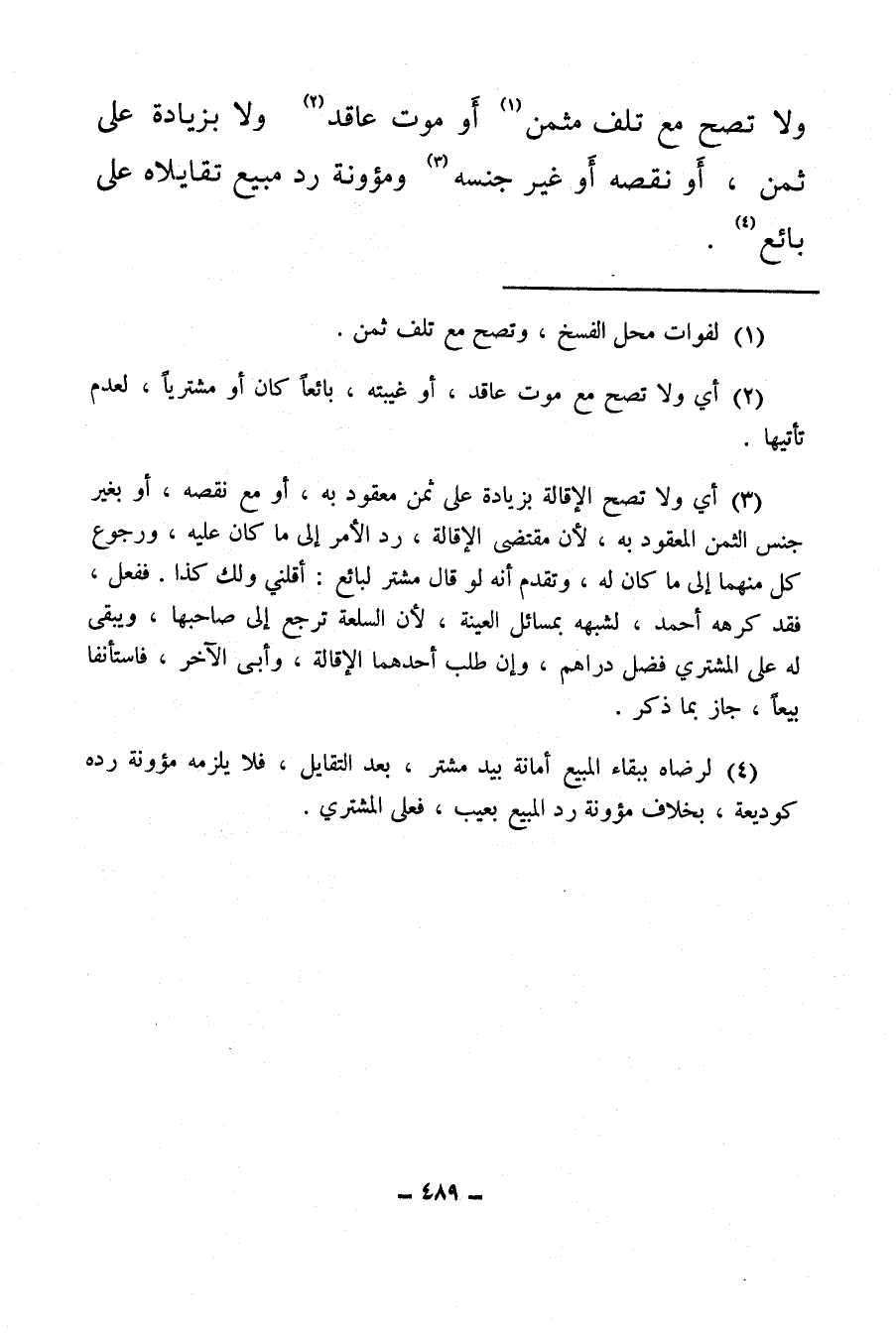 (¬3) أي ولا تصح الإقالة بزيادة على ثمن معقود به، أو مع نقصه، أو بغير جنس الثمن المعقود به، لأن مقتضى الإقالة، رد الأمر إلى ما كان عليه، ورجوع كل منهما إلى ما كان له، وتقدم أنه لو قال مشتر لبائع: أقلني ولك كذا، ففعل، فقد كرهه أحمد، لشبهه بمسائل العينة، لأن السلعة ترجع إلى صاحبها، ويبقى له على المشتري فضل دراهم، وإن طلب أحدهما الإقالة، وأبى الآخر، فاستأنفا بيعا، جاز بما ذكر.