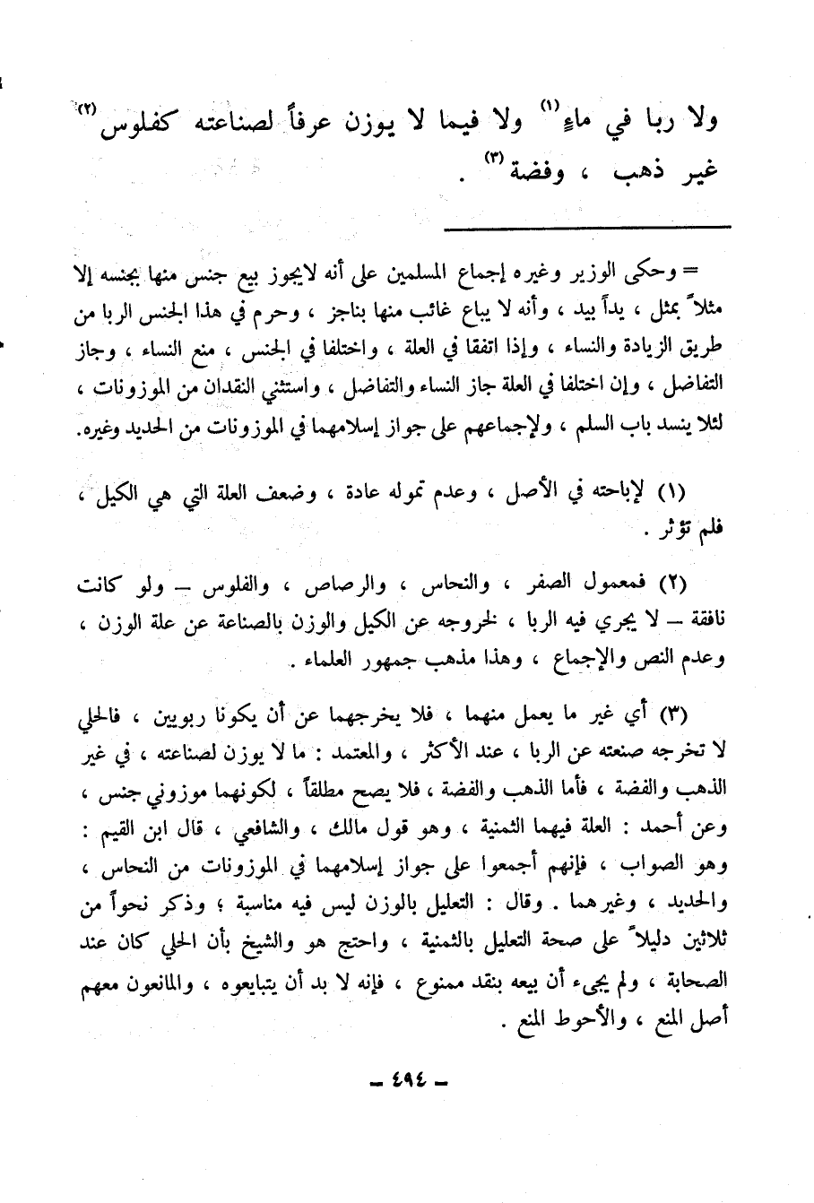 (¬3) أي غير ما يعمل منهما، فلا يخرجهما عن أن يكون ربوبيين فالحلي لا تخرجه صنعته عن الربا، عند الأكثر، والمعتمد: ما لا يوزن لصناعته، في غير الذهب والفضة، فأما الذهب والفضة فلا يصح مطلقا، لكونهما موزوني جنس وعن أحمد: العلة فيهما الثمنية وهو قول مالك، والشافعي، قال ابن القيم: وهو الصواب، فإنه أجمعوا على جواز إسلامهما في الموزونات من النحاس، والحديد وغيرهما، وقال: التعليل بالوزن ليس فيه مناسبة، وذكر نحوا من ثلاثين دليلا على صحة التعليل بالثمنية، واحتج هو والشيخ بأن الحلي كان عند الصحابة، ولم يجئ أن بيعه بنقد ممنوع، فإنه لا بد أن يتبايعوه، والمانعون معهم أصل المنع، والأحوط المنع.