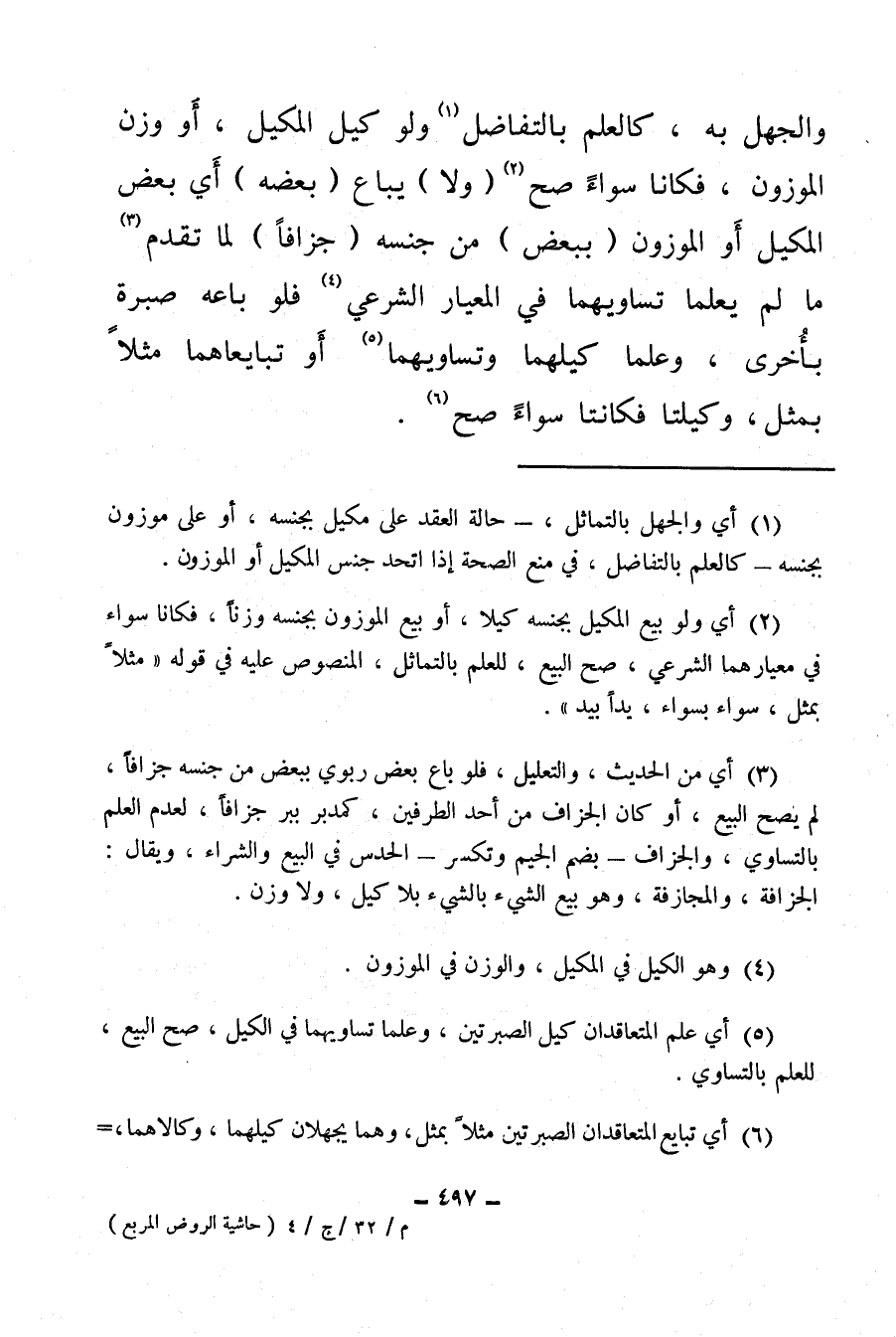 (¬2) أي ولو بيع المكيل بجنسه كيلا، أو بيع الموزون بجنسه وزنا، فكانا سواء في معيارهما الشرعي، صح البيع، للعلم بالتماثل، المنصوص عليه في قوله «مثلاً بمثل سواء بسواء، يدا بيد» .