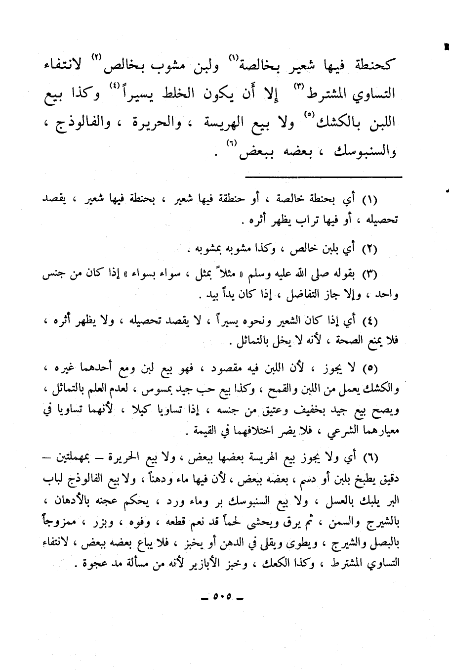 كحنطة فيها شعير بخالصة (¬1) ولبن مشوب بخالص (¬2) لانتفاء التساوي المشترط (¬3) إلا أن يكون الخلط يسيرا (¬4) وكذا بيع اللبن بالكشك (¬5) ولا بيع الهريسة، والحريرة، والفالوذج، والسنبوسك، بعضه ببعض (¬6) .