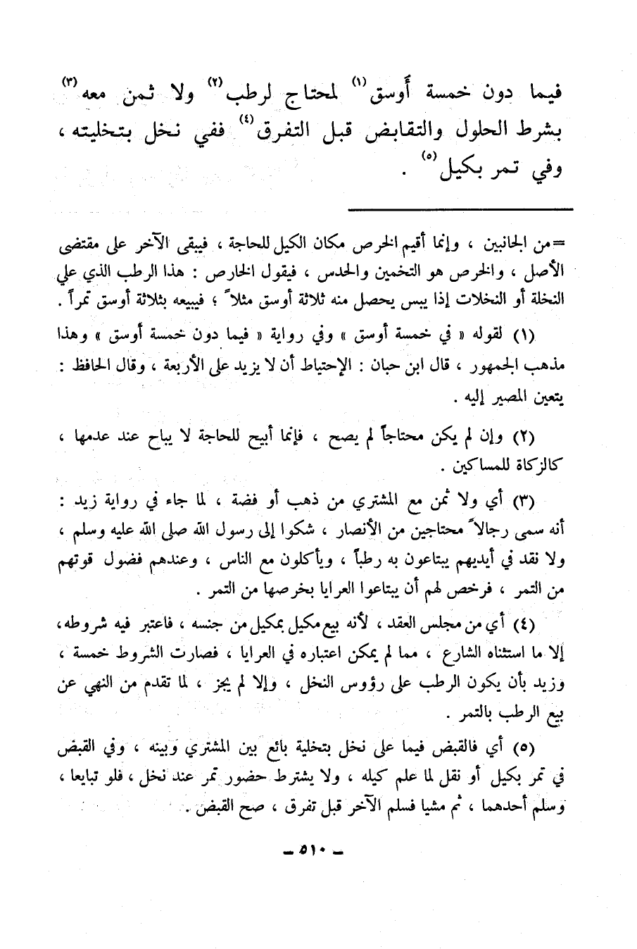 (¬4) أي من مجلس العقد، لأنه بيع مكيل بمكيل من جنسه، فاعتبر فيه شروطه، إلا ما استثناه الشارع، مما لم يمكن اعتباره في العرايا، فصارت الشروط خمسة، وزيد بأن يكون الرطب على رءوس النخل، وإلا لم يجز، لما تقدم من النهي عن بيع الرطب بالتمر.