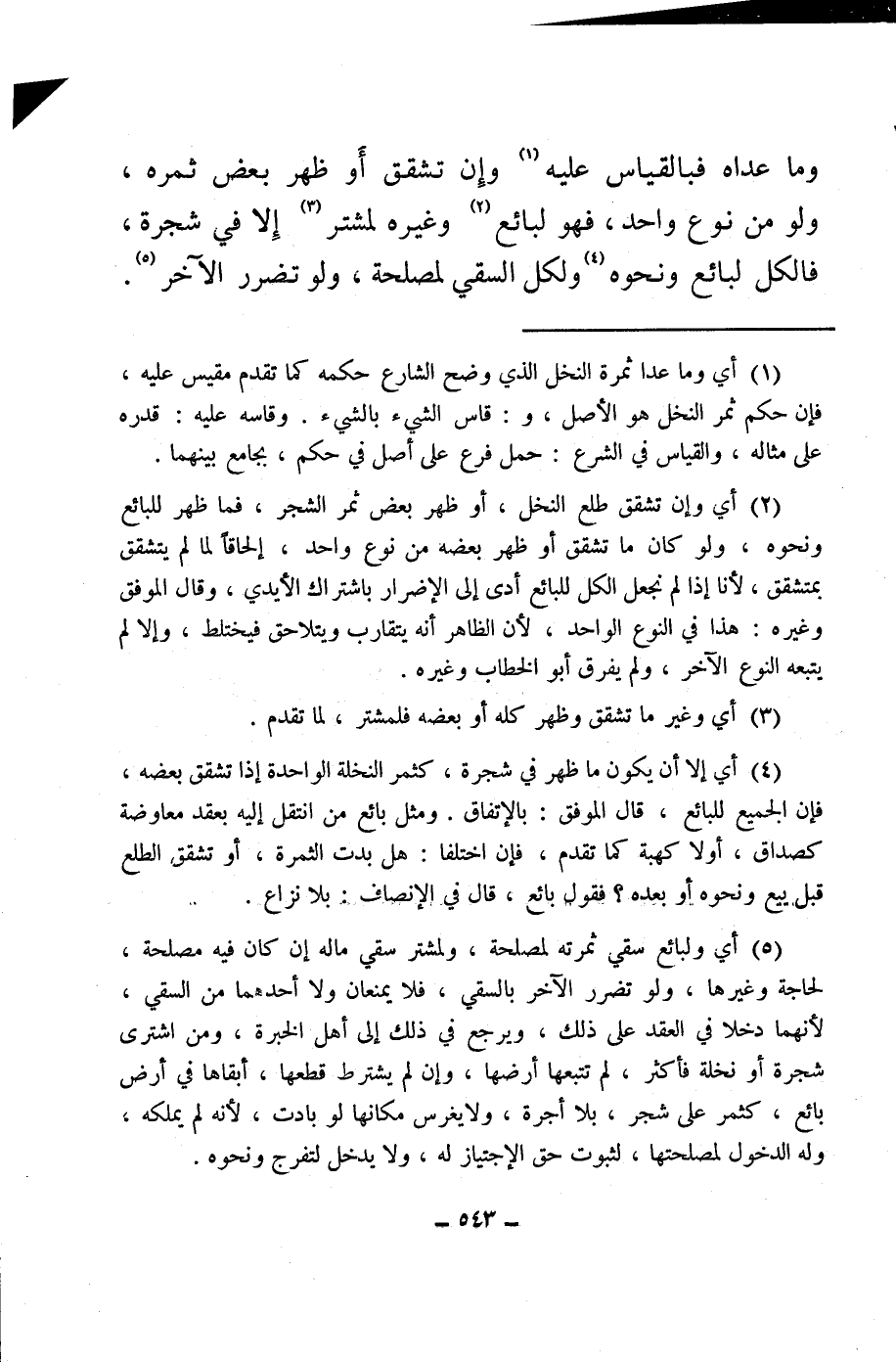 وما عداه فبالقياس عليه (¬1) وإن تشقق أو ظهر بعض ثمره، ولو من نوع واحد، فهو لبائع (¬2) وغيره لمشتر (¬3) إلا في شجرة، فالكل لبائع ونحوه (¬4) ولكل السقي لمصلحة، ولو تضرر الآخر (¬5) .