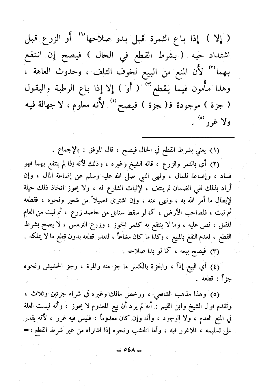 (¬2) أي بالثمر والزرع، قاله الشيخ وغيره، وذلك لأنه إذا لم ينتفع بهما فهو فساد، وإضاعة المال، ونهى النبي صلى الله عليه وسلم عن إضاعة المال، وإن أراد بذلك نفي الضمان لم ينتف لإثبات الشارع له، ولا يجوز اتخاذ ذلك حيلة لإبطال ما أمر الله به، ونهى عنه، وإن اشترى قصيلا من شعير ونحوه، فقطعه ثم نبت، فلصاحب الأرض، كما لو سقط سنابل من حاصد زرع، ثم نبت من العام المقبل نص عليه، وما لا ينتفع به كثمر الجوز، وزرع الترمس، لا يصح بشرط القطع، لعدم النفع بالمبيع، وكذا ما كان مشاعا، لتعذر قطعه بدون قطع ما لا يملكه.