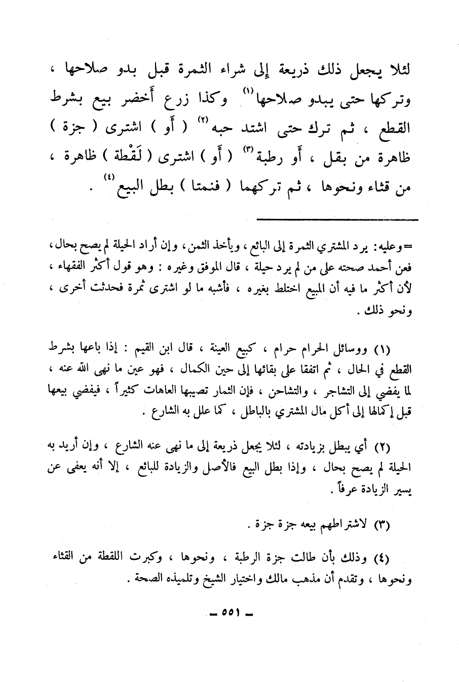(¬1) ووسائل الحرام حرام، كبيع العينة، قال ابن القيم: إذا باعها بشرط، القطع في الحال، ثم اتفقا على بقائها إلى حين الكمال، فهو عين ما نهى الله عنه، لما يفضي إلى التشاجر، والتشاحن، فإن الثمار تصيبها العاهات كثيرا، فيفضي بيعها قبل إكمالها إلى أكل مال المشتري بالباطل، كما علل به الشارع.