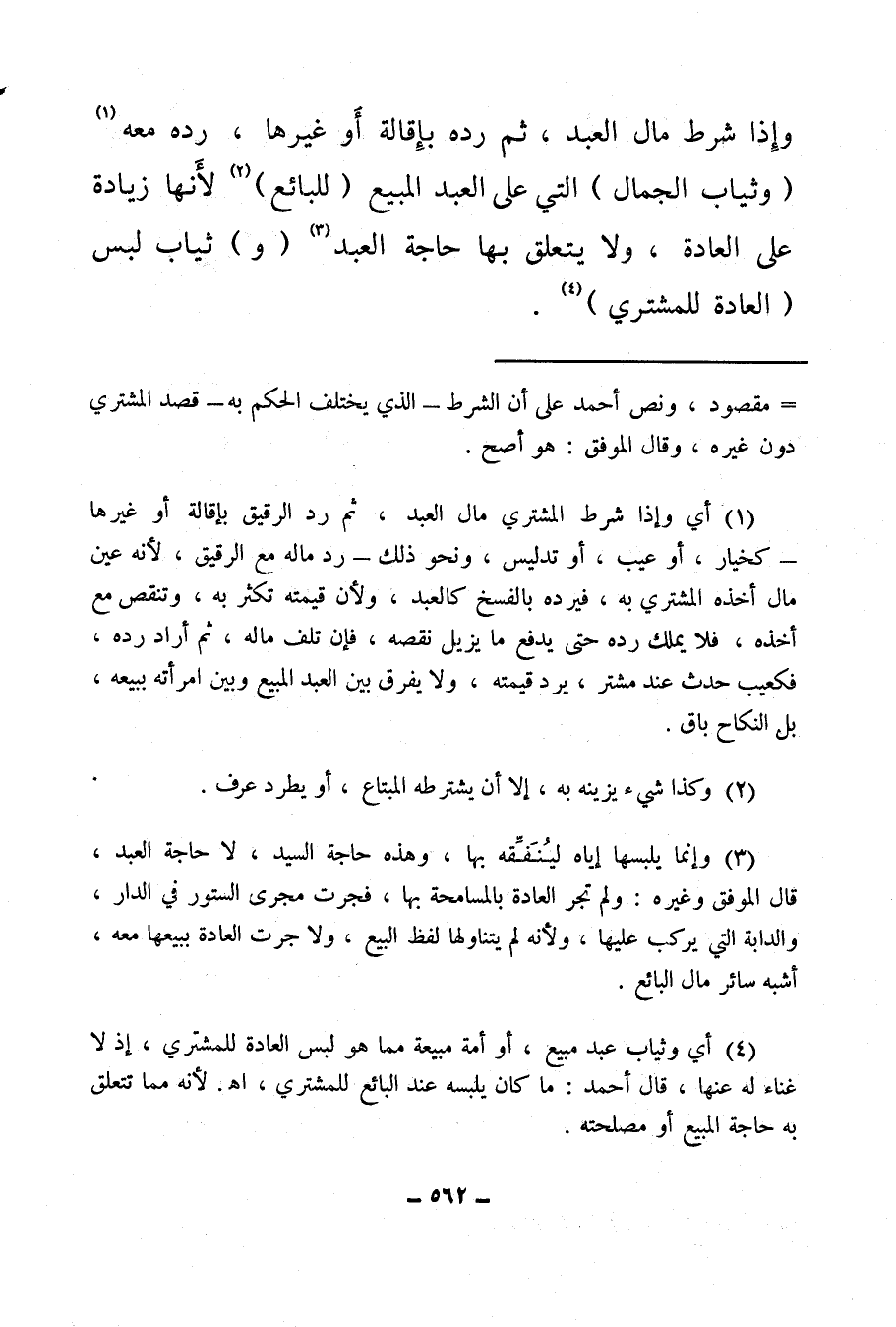 (¬4) أي وثياب عبد مبيع، أو أمة مبيعة مما هو لبس العادة للمشتري، إذ لا غناء له عنها، قال أحمد: ما كان يلبسه عند البائع للمشتري، اهـ. لأنه مما تعلق به حاجة المبيع أو مصلحته.