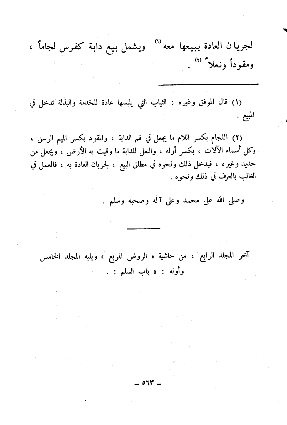 (¬2) اللجام بكسر اللام ما يجعل في فم الدابة، والمقود بكسر الميم الرسن، وكل أسماء الآلات، بكسر أوله، والنعل للدابة ما وقيت به الأرض، ويجعل من حديد وغيره، فيدخل ذلك ونحوه في مطلق البيع، لجريان العادة به، فالعمل في الغالب بالعرف في ذلك ونحوه.