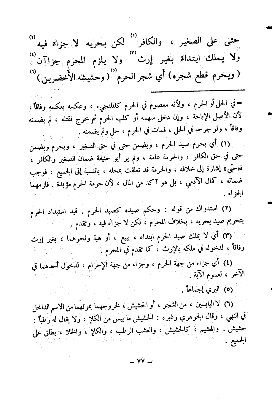 حتى على الصغير والكافر (¬1) لكن بحريه لا جزاء فيه (¬2) ولا يملك ابتداء بغير إرث (¬3) ولا يلزم المحرم جزاءان (¬4) (ويحرم قطع شجره) أي شجر الحرم (¬5) (وحشيشه الأخضرين) (¬6) .