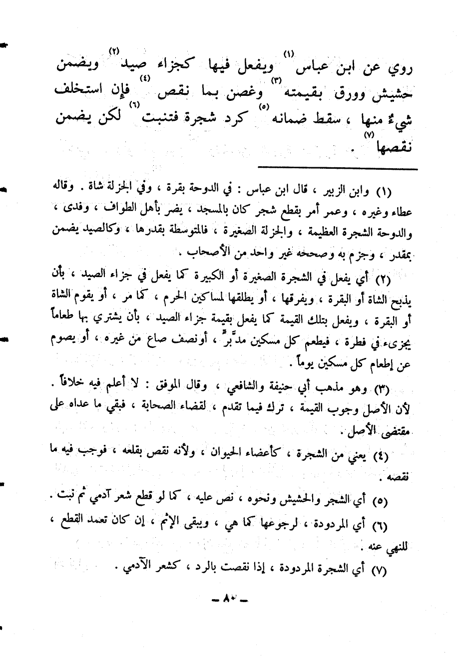 (¬1) وابن الزبير، قال ابن عباس: في الدوحة بقرة، وفي الجزلة شاة، وقاله عطاء وغيره، وعمر أمر بقطع شجر كان بالمسجد، يضر بأهل الطواف، وفدى، والدوحة الشجرة العظيمة، والجزلة الصغيرة، فالمتوسطة بقدرها، وكالصيد يضمن بمقدر وجزم به وصححه غير واحد من الأصحاب.
