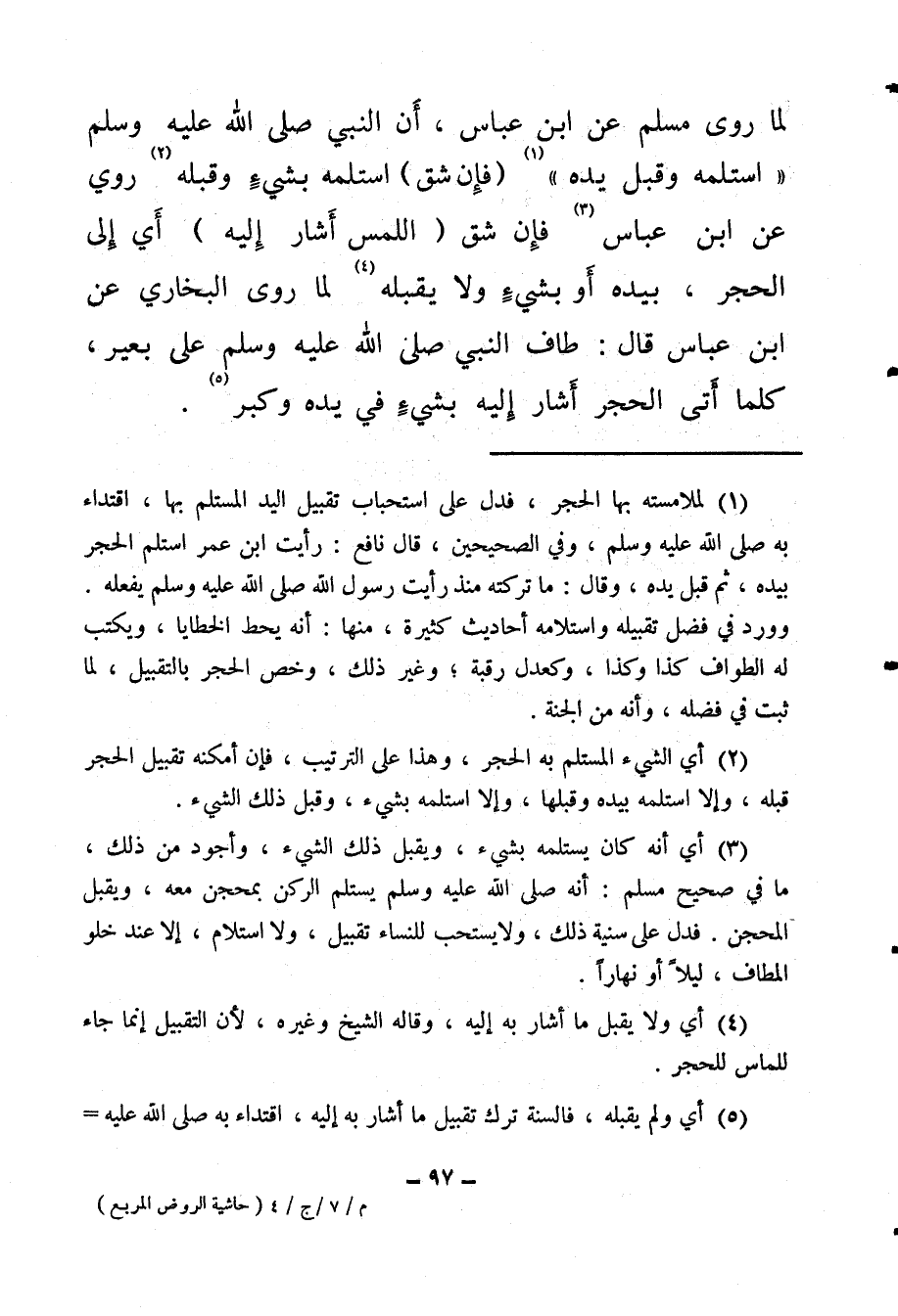 (¬1) لملامسته بها الحجر، فدل على استحباب تقبيل اليد المستلم بها، اقتداء به صلى الله عليه وسلم وفي الصحيحين قال نافع: رأيت ابن عمر استلم الحجر بيده، ثم قبل يده، وقال: ما تركته منذ رأيت رسول الله صلى الله عليه وسلم يفعله، وورد في فضل تقبيله واستلامه أحاديث كثيرة، منها: أنه يحط الخطايا، ويكتب له الطواف كذا وكذا، وكعدل رقبة، وغير ذلك، وخص الحجر بالتقبيل لما ثبت في فضله، وأنه من الجنة.