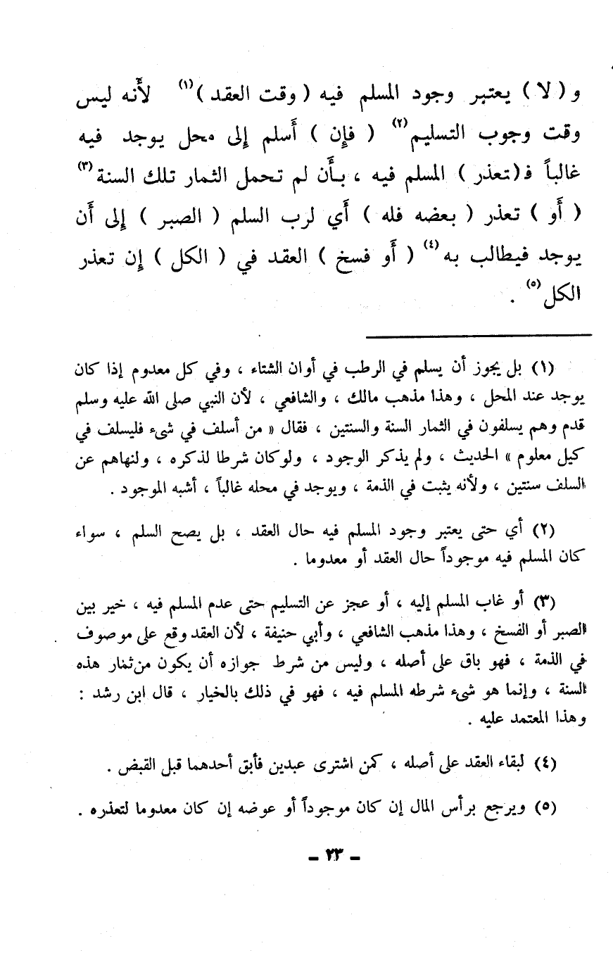 (¬2) أي حتى يعتبر وجود المسلم فيه حال العقد، بل يصح السلم، سواء كان المسلم فيه موجودًا حال العقد أو معدومًا.