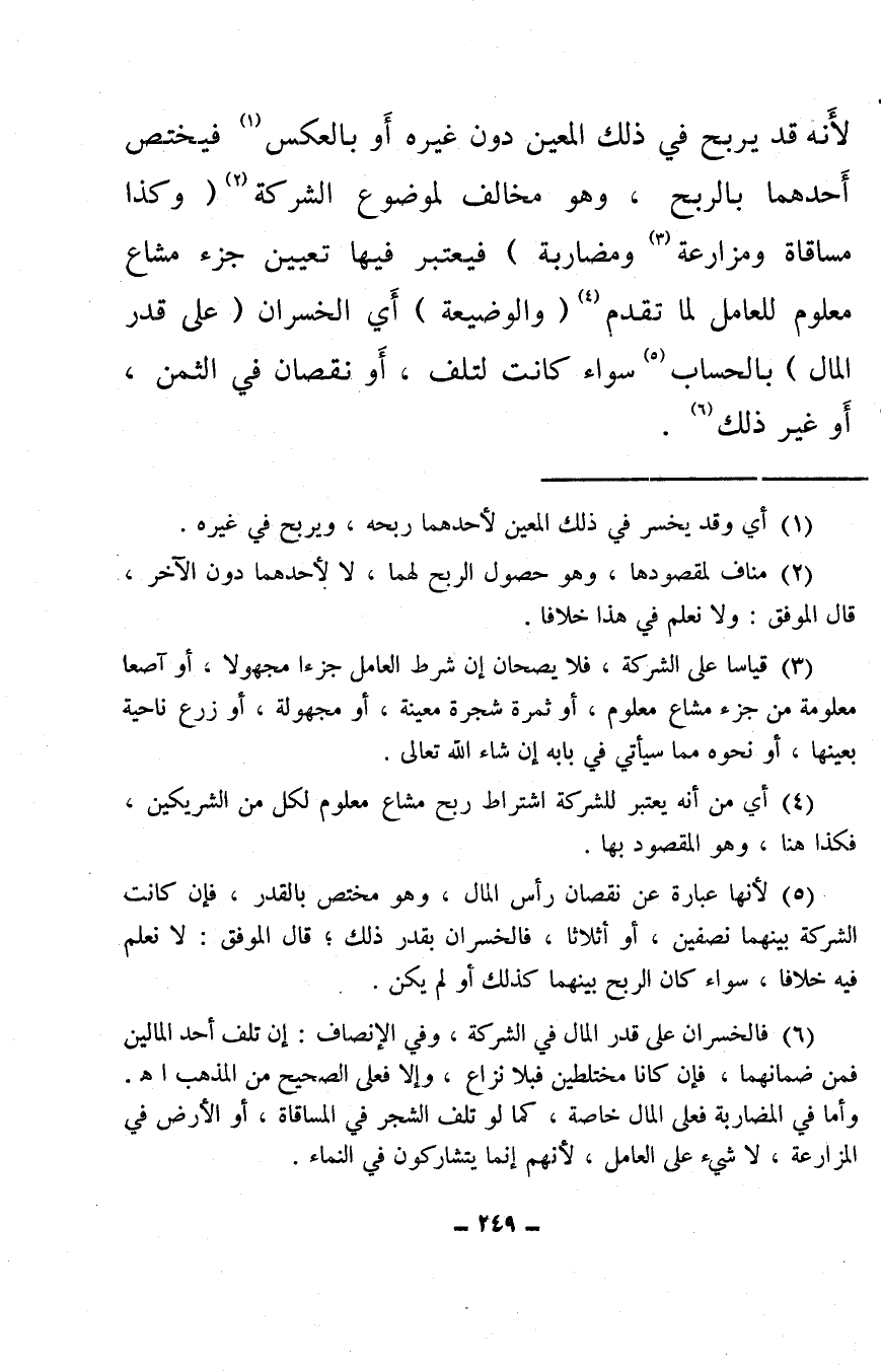 (¬6) فالخسران على قدر المال في الشركة، وفي الإنصاف: إن تلف أحد المالين فمن ضمانهما، فإن كانا مختلطين فبلا نزاع، وإلا فعلى الصحيح من المذهب. اهـ. وأما في المضاربة فعلى المال خاصة، كما لو تلف الشجر في المساقاة، أو الأرض في المزارعة، لا شيء على العامل، لأنهم إنما يتشاركون في النماء.