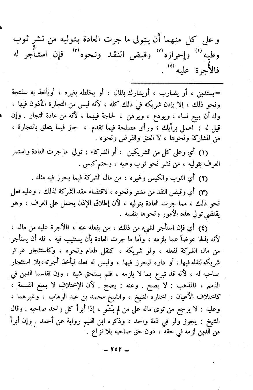 (¬1) أي وعلى كل من الشريكين، أو الشركاء: تولي ما جرت العادة واستمر العرف بتوليه، من نشر نحو ثوب وطيه، وختم كيس.