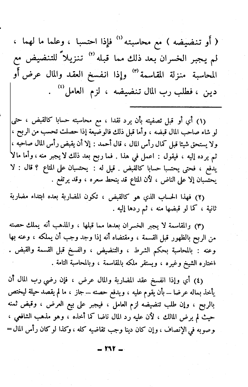(¬1) أي أو قبل تصفيته بأن يرد نقدا، مع محاسبته حسابا كالقبض، حتى لو شاء صاحب المال قبضه، وأما قبل ذلك فالوضيعة إذا حصلت تحسب من الربح، ولا يستحق شيئًا قبل كمال رأس المال، قال أحمد: إلا أن يقبض رأس المال صاحبه، ثم يرده إليه، فيقول: اعمل في هذا. فما ربح بعد ذلك لا يجبر منه، وأما ما لا يدفع، فحتى يحتسبا حسابا كالقبض. قيل له: يحتسبان على المتاع؟ قال: لا يحتسبان إلا على الناض، لأن المتاع قد ينحط سعره، وقد يرتفع.