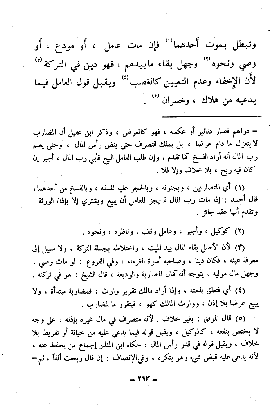 (¬1) أي المتضاربين، وبجنونه، وبالحجر عليه للسفه، وبالفسخ من أحدهما، قال أحمد: إذا مات رب المال لم يجز للعامل أن يبيع ويشتري إلا بإذن الورثة. وتقدم أنها عقد جائز.