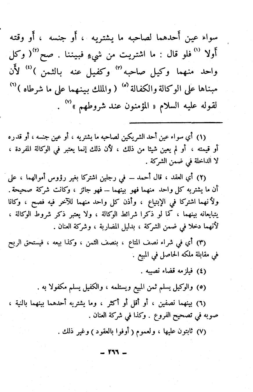 (¬1) أي سواء عين أحد الشريكين لصاحبه ما يشتريه، أو عين جنسه، أو قدره أو قيمته، أو لم يعين شيئًا من ذلك، لأن ذلك إنما يعتبر في الوكالة المفردة، لا الداخلة في ضمن الشركة.