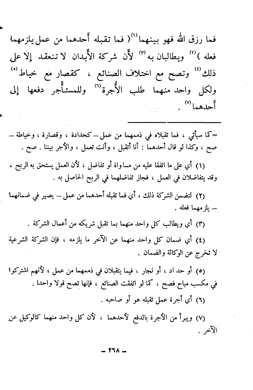 فما رزق الله فهو بينهما (¬1) (فما تقبله أحدهما من عمل يلزمهما فعله) (¬2) ويطالبان به (¬3) لأن شركة الأبدان لا تنعقد إلا على ذلك (¬4) وتصح مع اختلاف الصنائع، كقصار مع خياط (¬5) ولكل واحد منهما طلب الأُجرة (¬6) وللمستأْجر دفعها إلى أحدهما (¬7) .