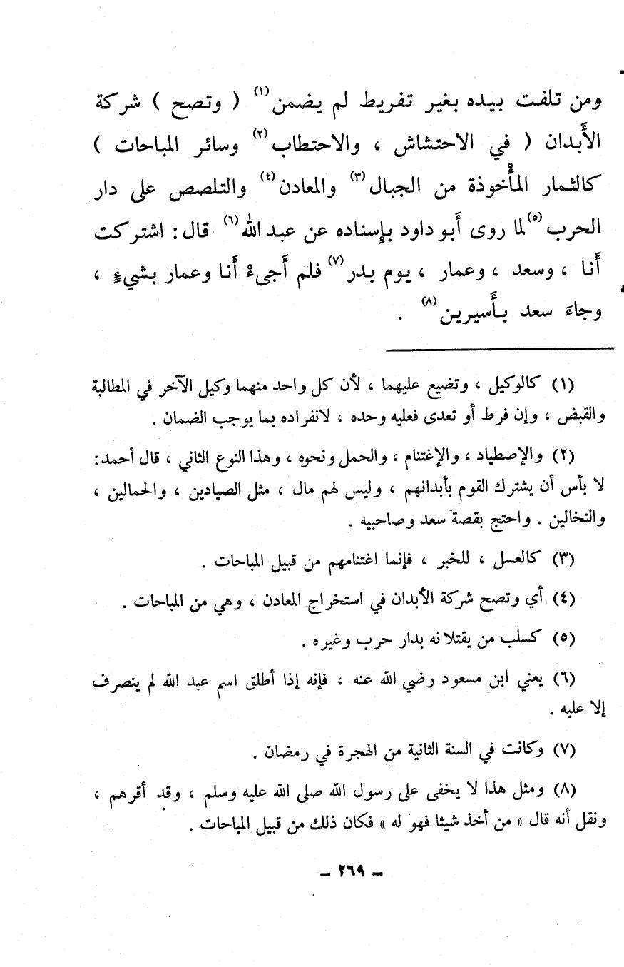 ومن تلفت بيده بغير تفريط لم يضمن (¬1) (وتصح) شركة الأبدان (في الاحتشاش، والاحتطاب (¬2) وسائر المباحات) كالثمار المأْخوذة من الجبال (¬3) والمعادن (¬4) والتلصص على دار الحرب (¬5) لما روى أبو داود بإسناده عن عبد الله (¬6) قال: اشتركت أنا، وسعد، وعمار، يوم بدر (¬7) فلم أجئ أنا وعمار بشيء، وجاء سعد بأسيرين (¬8) .