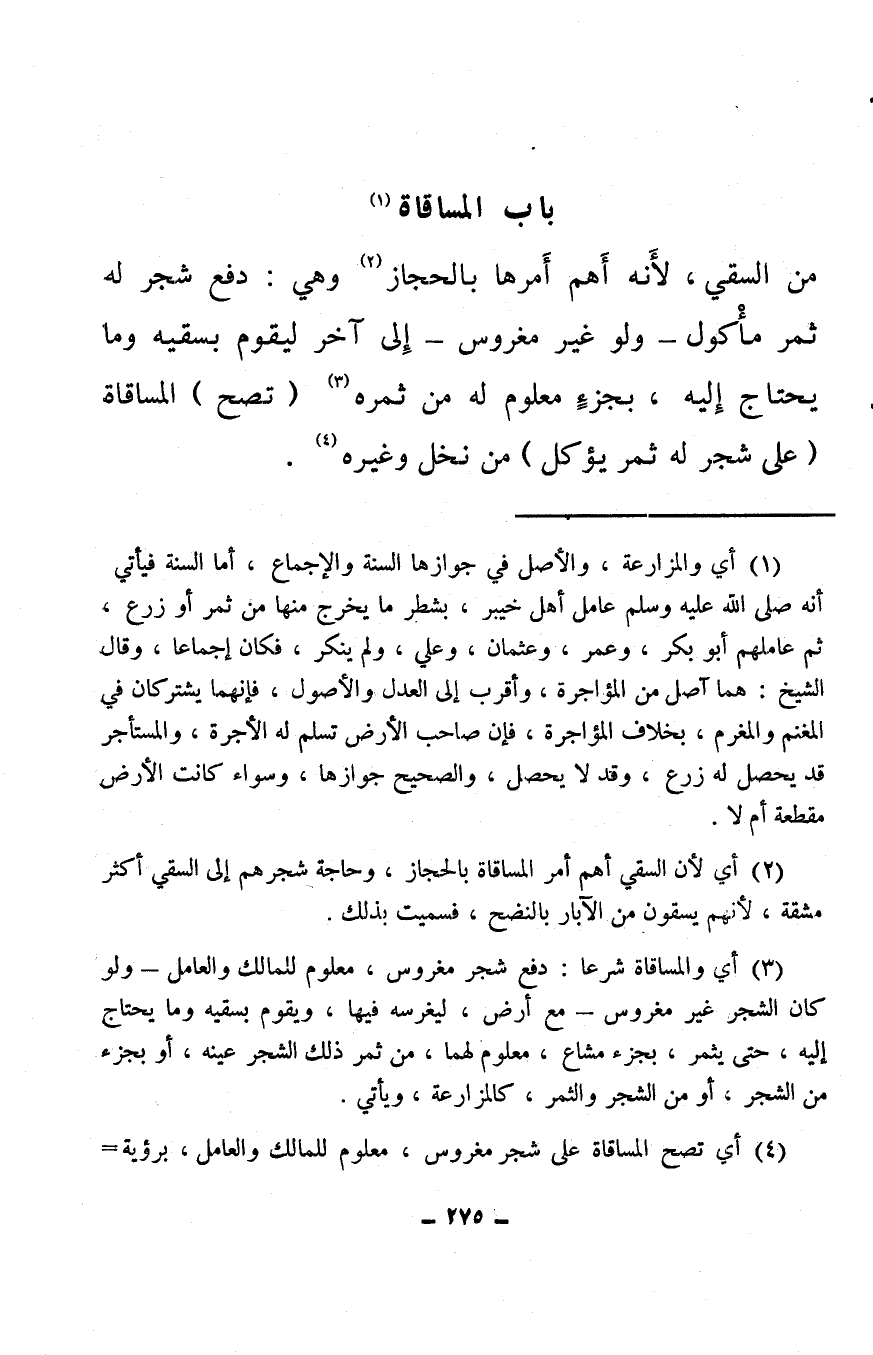 (¬3) أي والمساقاة شرعا: دفع شجر مغروس، معلوم للمالك والعامل – ولو كان الشجر غير مغروس – مع أرض، ليغرسه فيها، ويقوم بسقيه وما يحتاج إليه، حتى يثمر، بجزء مشاع، معلوم لهما، من ثمر ذلك الشجر عينه، أو بجزء من الشجر، أو من الشجر والثمر، كالمزارعة، ويأتي.
