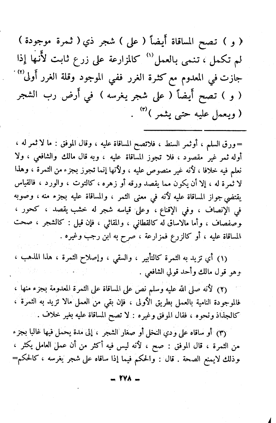 (¬2) لأنه صلى الله عليه وسلم نص على المساقاة على الثمرة المعدومة بجزء منها، فالموجودة النامية بالعمل بطريق الأولى، فإن بقي من العمل ما لا تزيد به الثمرة، كالجذاذ ونحوه، فقال الموفق وغيره: لا تصح المساقاة عليه بغير خلاف.