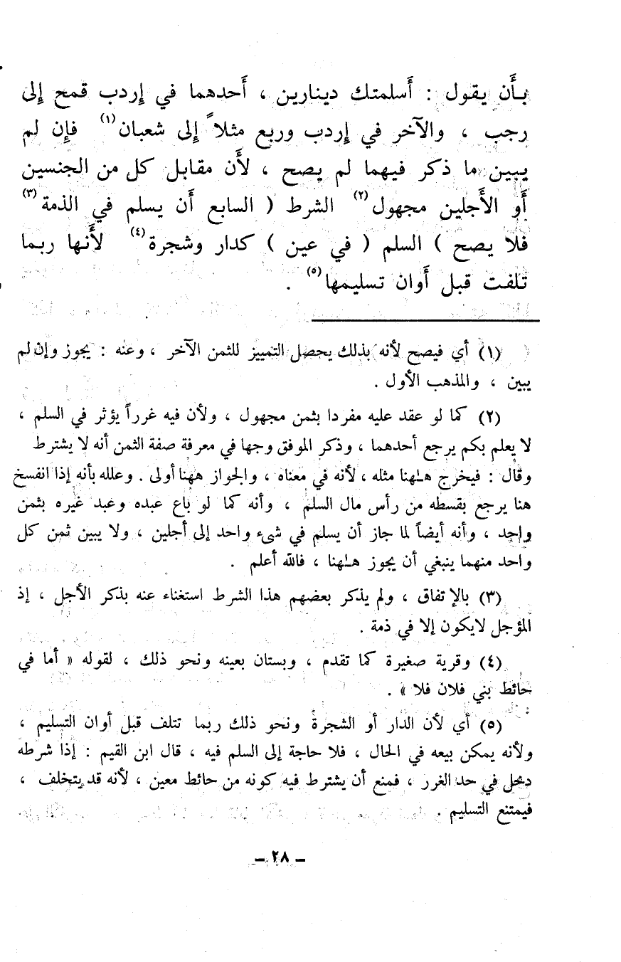 (¬5) أي لأن الدار أو الشجرة ونحو ذلك ربما تتلف قبل أوان التسليم، ولأنه يمكن بيعه في الحال، فلا حاجة إلى السلم فيه، قال ابن القيم: إذا شرطه دخل في حد الغرر، فمنع أن يشترط فيه كونه من حائط معين، لأنه قد يتخلف، فيمتنع التسليم.