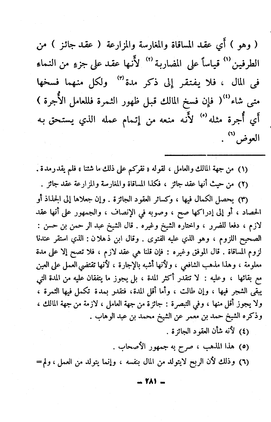 (¬3) يحصل الكمال فيها، وكسائر العقود الجائرة. وإن جعلاها إلى الجذاذ أو الحصاد، أو إلى إدراكها صح، وصوبه في الإنصاف، والجمهور على أنها عقد لازم، دفعا للضرر، واختاره الشيخ وغيره. قال الشيخ عبد الرحمن بن حسن: الصحيح اللزوم، وهو الذي عليه الفتوى. وقال ابن ذهلان: الذي استقر عندنا لزوم المساقاة. قال الموفق وغيره: فإن قلنا هي عقد لازم، فلا تصح إلا على مدة معلومة، وهذا مذهب الشافعي، ولأنها أشبه بالإجارة، لأنها تقتضي العمل على العين مع بقائها، وعليه: لا تتقدر أكثر المدة، بل يجوز ما يتفقان عليه من المدة التي يبقى الشجر فيها، وإن طالت، وأما أقل المدة، فتقدر بمدة تكمل فيها الثمرة، ولا يجوز أقل منها، وفي التبصرة: جائزة من جهة العامل، لازمة من جهة المالك، وذكره الشيخ حمد بن معمر عن الشيخ محمد بن عبد الوهاب.