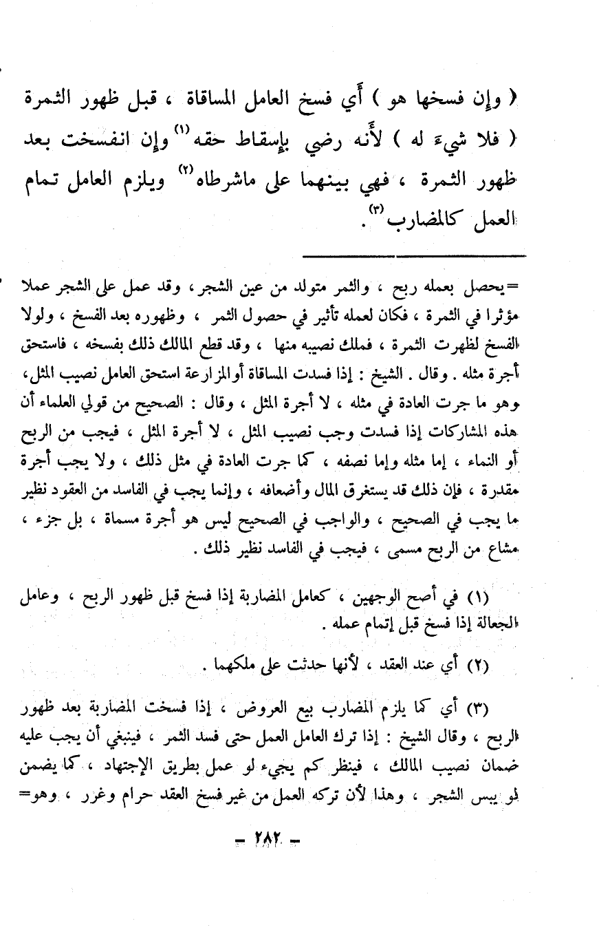 (¬3) أي كما يلزم المضارب بيع العروض، إذا فسخت المضاربة بعد ظهور الربح، وقال الشيخ: إذا ترك العامل العمل حتى فسد الثمر، فينبغي أن يجب عليه ضمان نصيب المالك، فينظر كم يجيء لو عمل بطريق الاجتهاد، كما يضمن لو يبس الشجر، وهذا لأن تركه العمل من غير فسخ العقد حرام وغرر، وهو سبب في عدم هذا الثمر، فيكون كما لو تلفت الثمرة تحت اليد العادية. وقال: والأصوب الأقيس بالمذهب أن يضمن بمثل ما ينبت ضمان تغرير. اهـ.