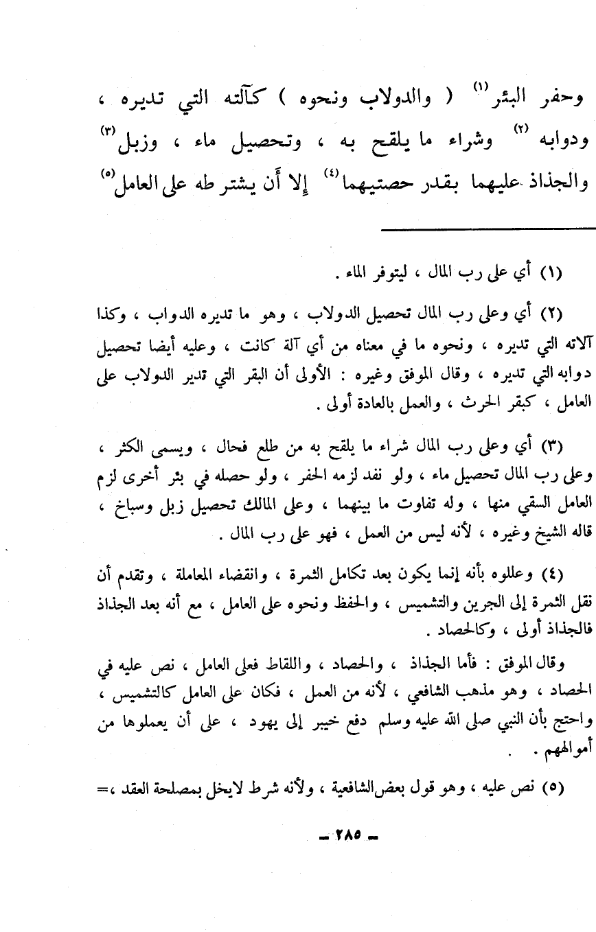 (¬2) أي وعلى رب المال تحصيل الدولاب، وهو ما تديره الدولاب، وكذا آلاته التي تديره، ونحوه ما في معناه من أي آلة كانت، وعليه أيضًا تحصيل دوابه التي تديره، وقال الموفق وغيره: الأولى أن البقر التي تدير الدولاب على العامل، كبقر الحرث، والعمل بالعادة أولى.
