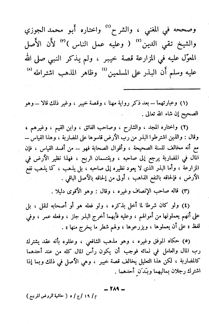 (¬2) واختاره المجد، والشارح، وصاحب الفائق، وابن القيم، وغيرهم، وقال: والذين اشترطوا البذر من رب الأرض قاسوها على المضاربة، وهذا القياس – مع أنه مخالف للسنة الصحيحة، وأقوال الصحابة فهو – من أفسد القياس، فإن المال في المضاربة يرجع إلى صاحبه، ويقتسمان الربح، فهذا نظير الأرض في المزارعة، وأما البذر الذي لا يعود نظيره إلى صاحبه، بل يذهب، كما يذهب نفع الأرض، فإلحاقه بالنفع الذاهب، أولى من إلحاقه بالأصل الباقي.