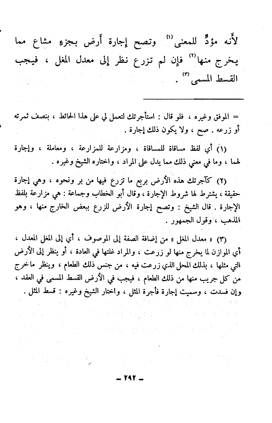 لأَنه مؤدًّ للمعنى (¬1) وتصح إجارة أرض بجزء مشاع مما يخرج منها (¬2) فإن لم تزرع نظر إلى معدل المغل، فيجب القسط المسمى (¬3) .