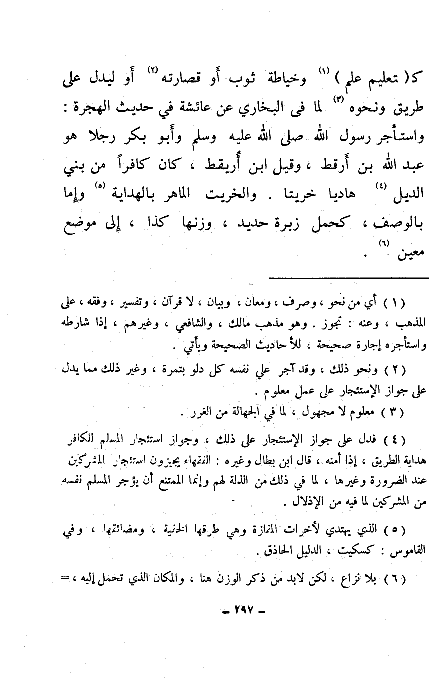 كـ (تعليم علم) (¬1) وخياطة ثوب أو قصارته (¬2) أو ليدل على طريق ونحوه (¬3) لما في البخاري عن عائشة في حديث الهجرة: واستأجر رسول الله صلى الله عليه وسلم وأبو بكر رجلاً هو عبد الله بن أرقط، وقيل ابن أُريقط، كان كافرًا من بني الديل (¬4) هاديا خريتا. والخريت الماهر بالهداية (¬5) وإما بالوصف، كحمل زبرة حديد، وزنها كذا، إلى موضع معين (¬6) .