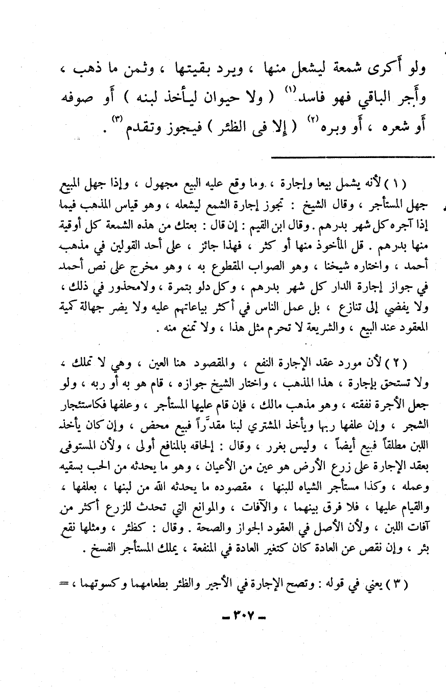 (¬1) لأنه يشمل بيعا وإجارة، وما وقع عليه البيع مجهول، وإذا جهل المبيع جهل المستأجر، وقال الشيخ: تجوز إجارة الشمع ليشعله، وهو قياس المذهب فيما إذا آجره كل شهر بدرهم. وقال ابن القيم: إن قال: بعتك من هذه الشمعة كل أوقية منها بدرهم. قل المأخوذ منها أو كثر، فهذا جائز، على أحد القولين في مذهب أحمد، واختاره شيخنا، وهو الصواب المقطوع به، وهو مخرج على نص أحمد في جواز إجارة الدار كل شهر بدرهم، وكل دلو بتمرة، ولا محذور في ذلك، ولا يفضي إلى تنازع، بل عمل الناس في أكثر بياعاتهم عليه ولا يضر جهالة كمية المعقود عند البيع، والشريعة لا تحرم مثل هذا، ولا تمنع منه.