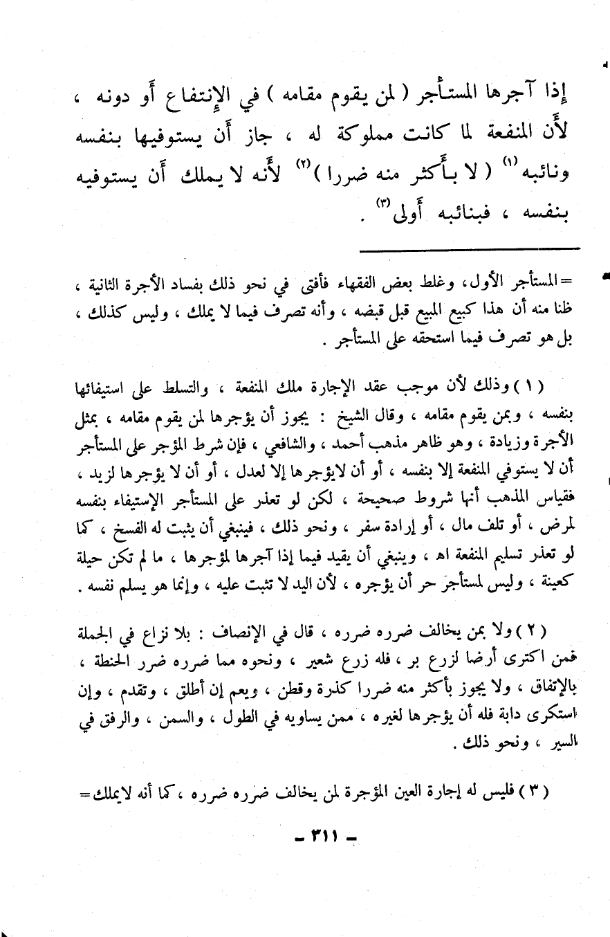 (¬1) وذلك لأن موجب عقد الإجارة ملك المنفعة، والتسلط على استيفائها بنفسه، وبمن يقوم مقامه، وقال الشيخ: يجوز أن يؤجرها لمن يقوم مقامه، بمثل الأجرة وزيادة، وهو ظاهر مذهب أحمد، والشافعي، فإن شرط المؤجر على المستأجر أن لا يستوفي المنفعة إلا بنفسه، أو أن لا يؤجرها إلا لعدل، أو أن لا يؤجرها لزيد، فقياس المذهب أنها شروط صحيحة، لكن لو تعذر على المستأجر الاستيفاء بنفسه لمرض، أو تلف مال، أو إرادة سفر، ونحو ذلك، فينبغي أن يثبت له الفسخ، كما لو تعذر تسليم المنفعة. اهـ. وينبغي أن يقيد فيما إذا آجرها لمؤجرها، ما لم تكن حيلة كعينة، وليس لمستأجر حر أن يؤجره، لأن اليد لا تثبت عليه، وإنما هو يسلم نفسه.