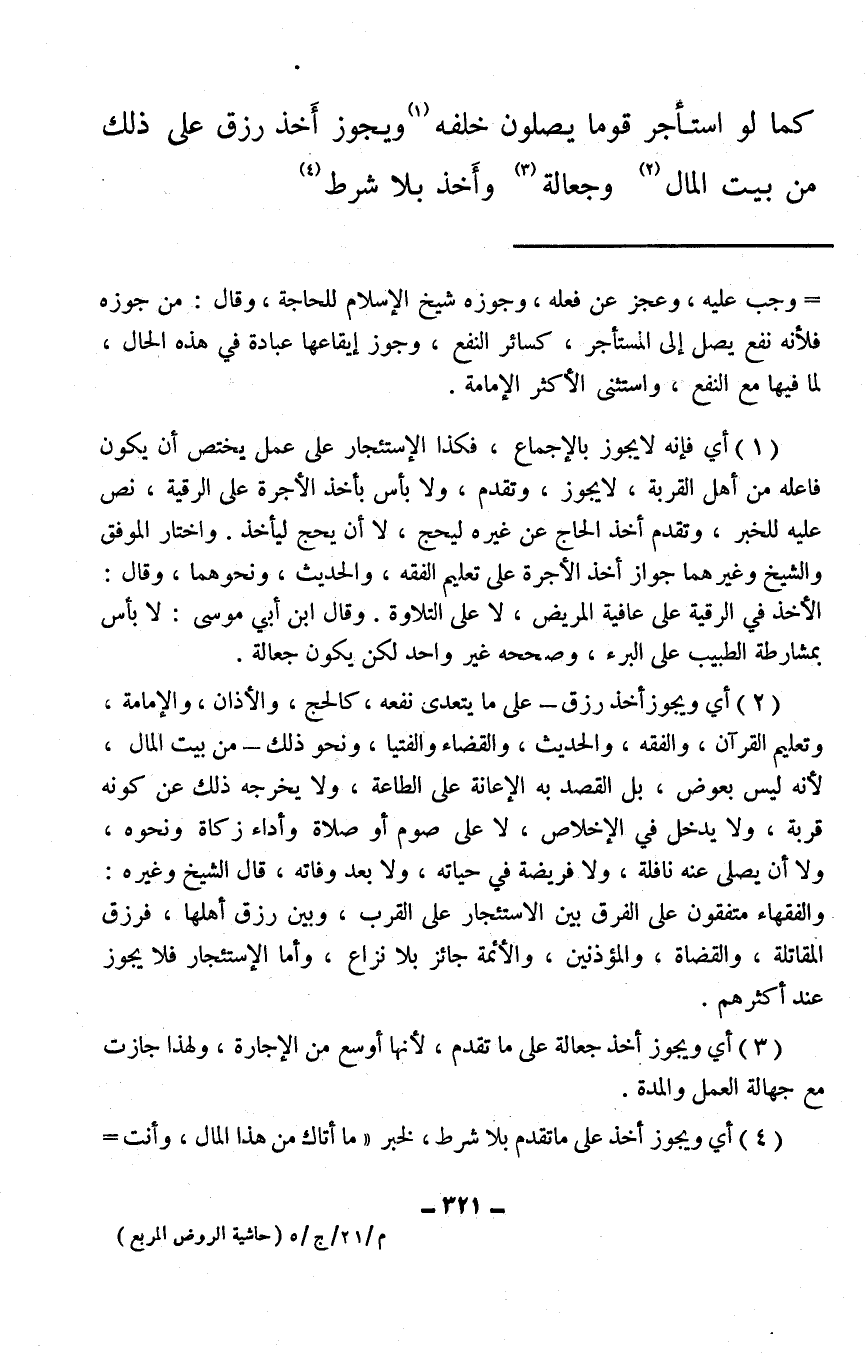 (¬2) أي ويجوز أخذ رزق – على ما يتعدى نفعه، كالحج، والأذان، والإمامة، وتعليم القرآن، والفقه، والحديث، والقضاء والفتيا، ونحو ذلك – من بيت المال، لأنه ليس بعوض، بل القصد به الإعانة على الطاعة، ولا يخرجه ذلك عن كونه قربة، ولا يدخل في الإخلاص، لا على صوم أو صلاة وأداء زكاة ونحوه، ولا أن يصلى عنه نافلة، ولا فريضة في حياته، ولا بعد وفاته، قال الشيخ وغيره: والفقهاء متفقون على الفرق بين الاستئجار على القرب، وبين رزق أهلها، فرزق المقاتلة، والقضاة، والمؤذنين، والأئمة جائز بلا نزاع، وأما الاستئجار فلا يجوز عند أكثرهم.