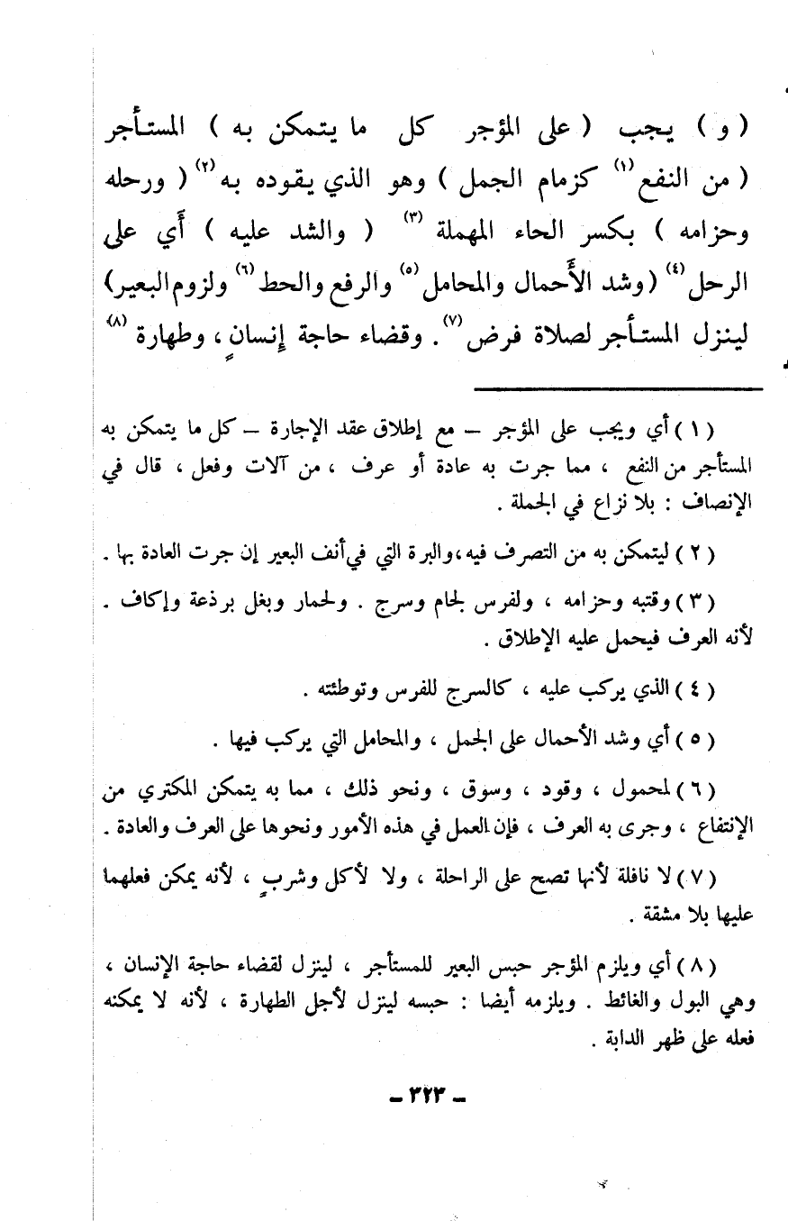 (¬8) أي ويلزم المؤجر حبس البعير للمستأجر، لينزل لقضاء حاجة الإنسان، وهي البول والغائط. ويلزمه أيضًا: حبسه لينزل لأجل الطهارة، لأنه لا يمكنه فعله على ظهر الدابة.