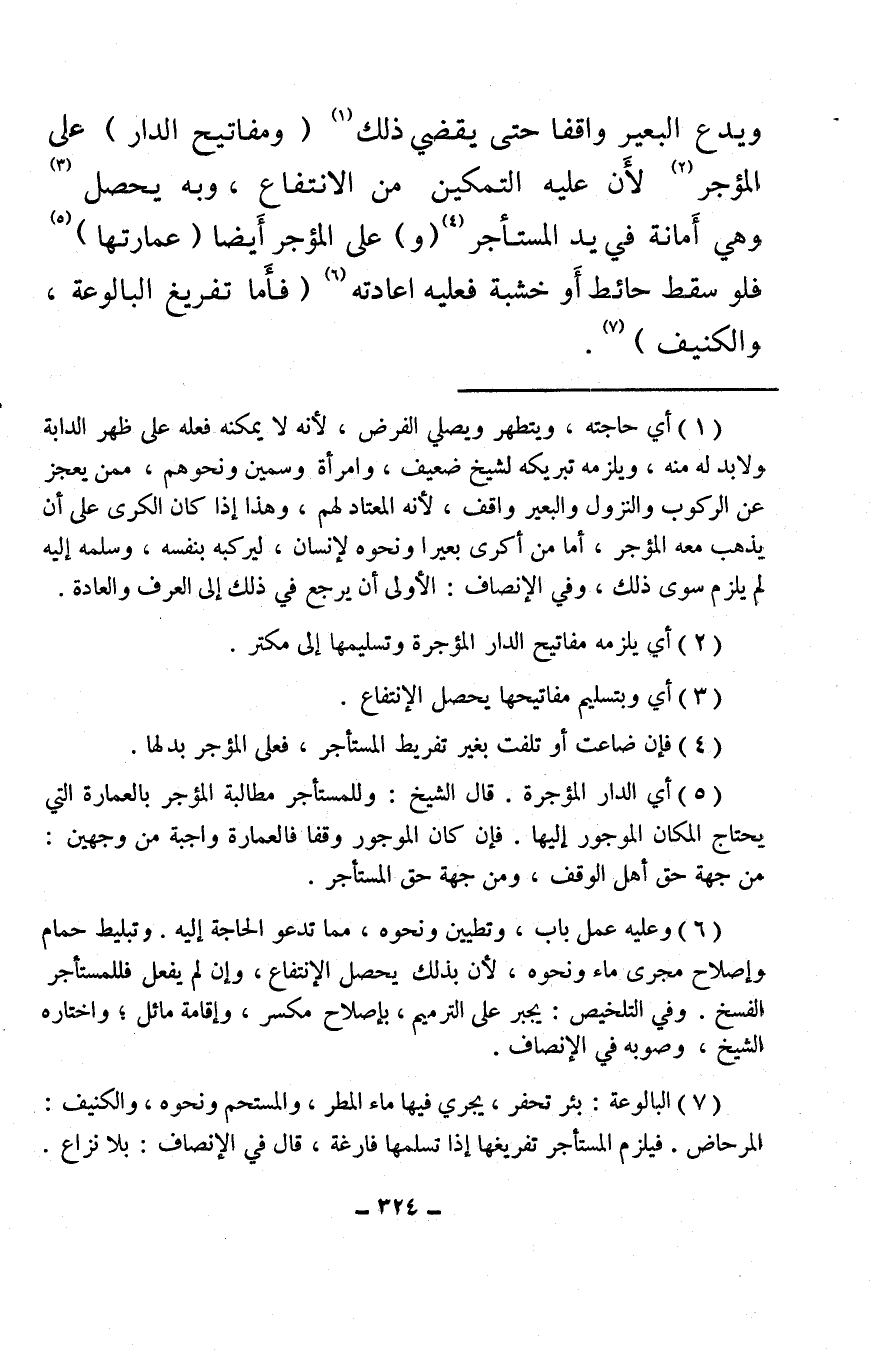 (¬5) أي الدار المؤجرة، قال الشيخ: وللمستأجر مطالبة المؤجر بالعمارة التي يحتاج المكان الموجور إليها. فإن كان الموجور وقفا فالعمارة واجبة من وجهين: من جهة حق أهل الوقف، ومن جهة حق المستأجر.